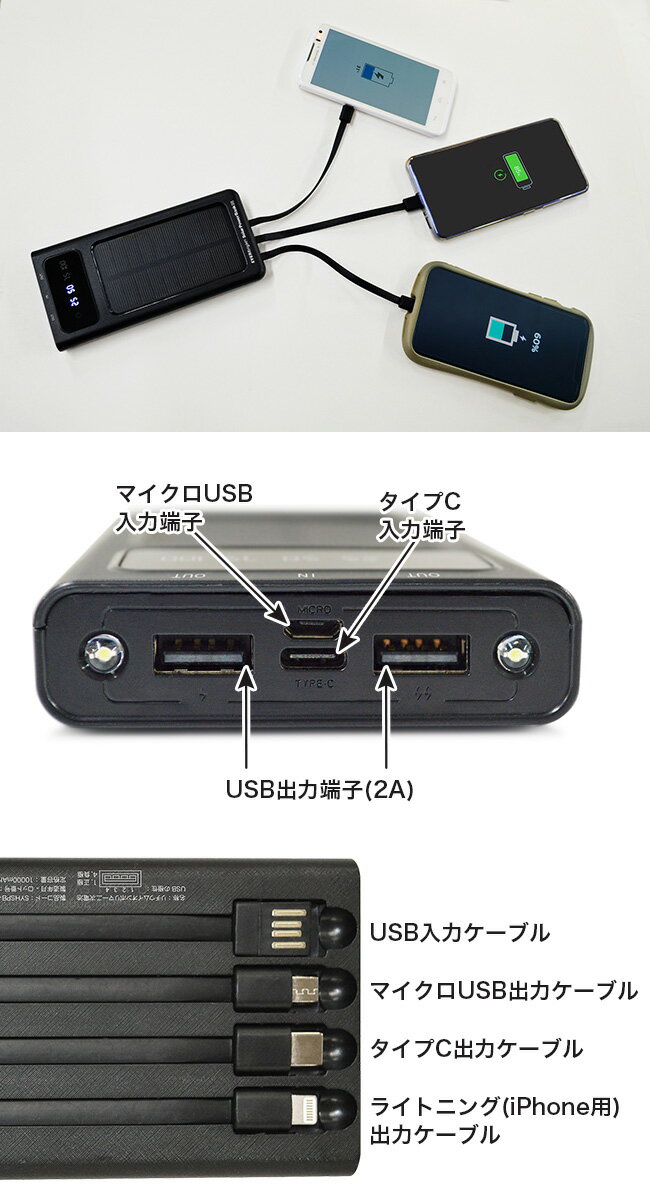 エバーブライト ソーラーパワーバンク IIIZの解説 大容量10,000mAh!3本の内蔵充電出力ケーブルと2個のUSB出力を使えば、iPhone12をはじめ最大5台のデバイスを同時に充電可能。 パワーバンクへのUSB入力充電ケーブルも内蔵。タイプC、マイクロUSB充電入力端子も装備。 太陽光、照明でフル充電状態にしておけば、いつでもどこでもすぐに使えます。スマホなら約3回の充電が可能。 USB充電の場合は、4段階の電池残量インジケーター点滅で確認。フル充電で点灯、電池残量は4段階で表示。ソーラーパネル充電中はインジケーターで確認可能。 2灯式LEDライトも搭載しているので、簡易的な懐中電灯としても使えます。災害などによる停電、キャンプなどのアウトドアにも便利。 エバーブライト ソーラーパワーバンク IIIZの詳細 商品名: エバーブライト ソーラーパワーバンク IIIZ 説明: 10000mAh 1万mAh 充電器 モバイルバッテリー バッテリー 充電 機器 スマホ iPhone スマートフォン アイフォン アイフォーン タイプC キャンプ アウトドア 災害 停電 災害時 避難 避難所 用途・場所: スマホ スマートフォン iPhone 最大 5台 充電 ソーラー充電 災害 震災 停電時 持ち出し 災害対策 自宅 避難所 家庭 カテゴリー: 充電機 コード 照明 ライト 懐中電灯 色: ブラック 黒 サイズ: コンパクト 種類: 10000mAh USB 太陽光 ソーラー 対象: 家族 ファミリー 自分 自分用サイズ(約) 148×71×19mm 重量(約) 240g 素材 ABS 仕様 電池:リチウムイオンポリマー電池(電圧3.7V・容量10,000mAh)フル充電までの時間(USB):1A入力6~8時間・2A入力12~15時間LEDライト:電源スイッチ長押し ON/OFF(フル充電で78時間)充電出力電圧/電流:USB端子×2個(各5V/2A)※2個同時接続の場合は5V/1A×2個充電入力電圧/電流:マイクロUSB端子×1個(5V/2A)、タイプC端子×1個(5V/2A)保護機能:過充電保護、過放電保護、ショート(短絡)保護、過電流保護 内蔵充電ケーブル 出力(各5V/2A):マイクロUSB、タイプC、iPhoneライトニング(複数台常時充電の場合は出力電流は合計で2A)入力(各5V/2A):USB-A(ハーフサイズ) 充電中表示 USB:4個(25・50・75・100)のインジケーターが充電内容に応じて点滅。充電が完了すると全部点灯し、充電はストップする。ソーラー:充電中は緑インジケーター(1個)が点灯。充電内容を確認するには電源スイッチを1回押して、4個のインジケーターで確認。 原産国 中国 PSE適合 日本の電気用品安全法(PSE)の技術基準に適合した電気用品です。 PSマークの種類 特定電気用品以外の電気用品 届出事業者名 株式会社メテックス 定格電圧 公称電圧:5V/2A 定格電流 定格容量:10000mAh/3.7V ソーラーパワーバンク III+ ソーラーパワーバンク III+≪2個≫ ウルトラメガパワーステーション 100Wソーラーパネル ウルトラメガパワーステーション+100Wソーラーパネル