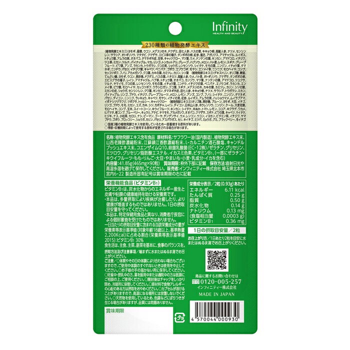 プレミアム 生酵素 90粒 x 2袋セット Premium Raw Enzyme 90 Capsules ・230種類の野草・野菜・果物を厳選 ・国内工場で長期熟成 ・健康と美容をサポートする成分を配合 ・90粒 ・1日目安量:2粒 植物発酵エキスは品質管理の徹底された国内工場のみで、長期熟成発酵しています。それぞれの工場で厳選した植物を使用し、品質面はもちろん安全面にも最新の注意を払って製造されています。飲みやすいソフトカプセルタイプ、しかも1日目安量2粒で不足しがちな栄養素が補えます。 1日あたり2粒を目安に水またはぬるま湯でお召し上がりください。 こんな方にオススメです 日頃野菜不足を感じている方 日々の健康維持を心がけている方 1袋サイズ:3cmx12cmx18cm 剤型タイプ別 粒 特徴 その他 ●広告文責:彩虹貿易合同会社 070-9243-7340 メーカー名/販売者名:インフィニティ 原産国:日本 商品区分:サプリメント