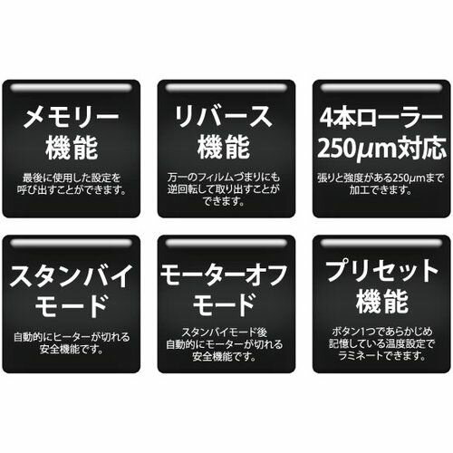 特長:●内部加熱ヒートロール方式を採用し、安定した連続ラミネートが可能です。●加熱と加圧を同時に行う為、ラミネートするものと、ラミネートフィルムの密着性が高く、フィルム中の気泡の発生も抑えられます。●リバース機能により、万一のフィルム詰まりにも逆回転して取り出すことが出来ます。●各スイッチを操作しない状態やラミネートしていない状態が15分続くと自動的に加熱を中止するスタンバイモードと、スタンバイモードからさらに45分経過するとモーターと冷却ファンが停止するモーターオフモードを搭載しました。●各フィルム厚に対応した設定を記憶するプリセット機能、最後に使用した設定を呼び出せるメモリー機能搭載で操作がより簡単になりました。 用途:●大切な印刷物や書類などの保護に。 仕様:●最大ラミネート厚さ(mm):0.8●消費電力(W):840●ラミネート速度(mm/秒)(50/60Hz):8.8/10.6●幅(mm):592●奥行(mm):310●高さ(mm):123●ウォームアップ時間(分):約5〜10 仕様2:●内部加熱方式●4本ローラー●100〜250ミクロン対応(片面厚) セット内容/付属品:●リアトレー、クリーニングペーパー、取り扱い説明書(保証書)特長:●内部加熱ヒートロール方式を採用し、安定した連続ラミネートが可能です。●加熱と加圧を同時に行う為、ラミネートするものと、ラミネートフィルムの密着性が高く、フィルム中の気泡の発生も抑えられます。●リバース機能により、万一のフィルム詰まりにも逆回転して取り出すことが出来ます。●各スイッチを操作しない状態やラミネートしていない状態が15分続くと自動的に加熱を中止するスタンバイモードと、スタンバイモードからさらに45分経過するとモーターと冷却ファンが停止するモーターオフモードを搭載しました。●各フィルム厚に対応した設定を記憶するプリセット機能、最後に使用した設定を呼び出せるメモリー機能搭載で操作がより簡単になりました。 用途:●大切な印刷物や書類などの保護に。 仕様:●最大ラミネート厚さ(mm):0.8●消費電力(W):840●ラミネート速度(mm/秒)(50/60Hz):8.8/10.6●幅(mm):592●奥行(mm):310●高さ(mm):123●ウォームアップ時間(分):約5〜10 仕様2:●内部加熱方式●4本ローラー●100〜250ミクロン対応(片面厚) セット内容/付属品:●リアトレー、クリーニングペーパー、取り扱い説明書(保証書)