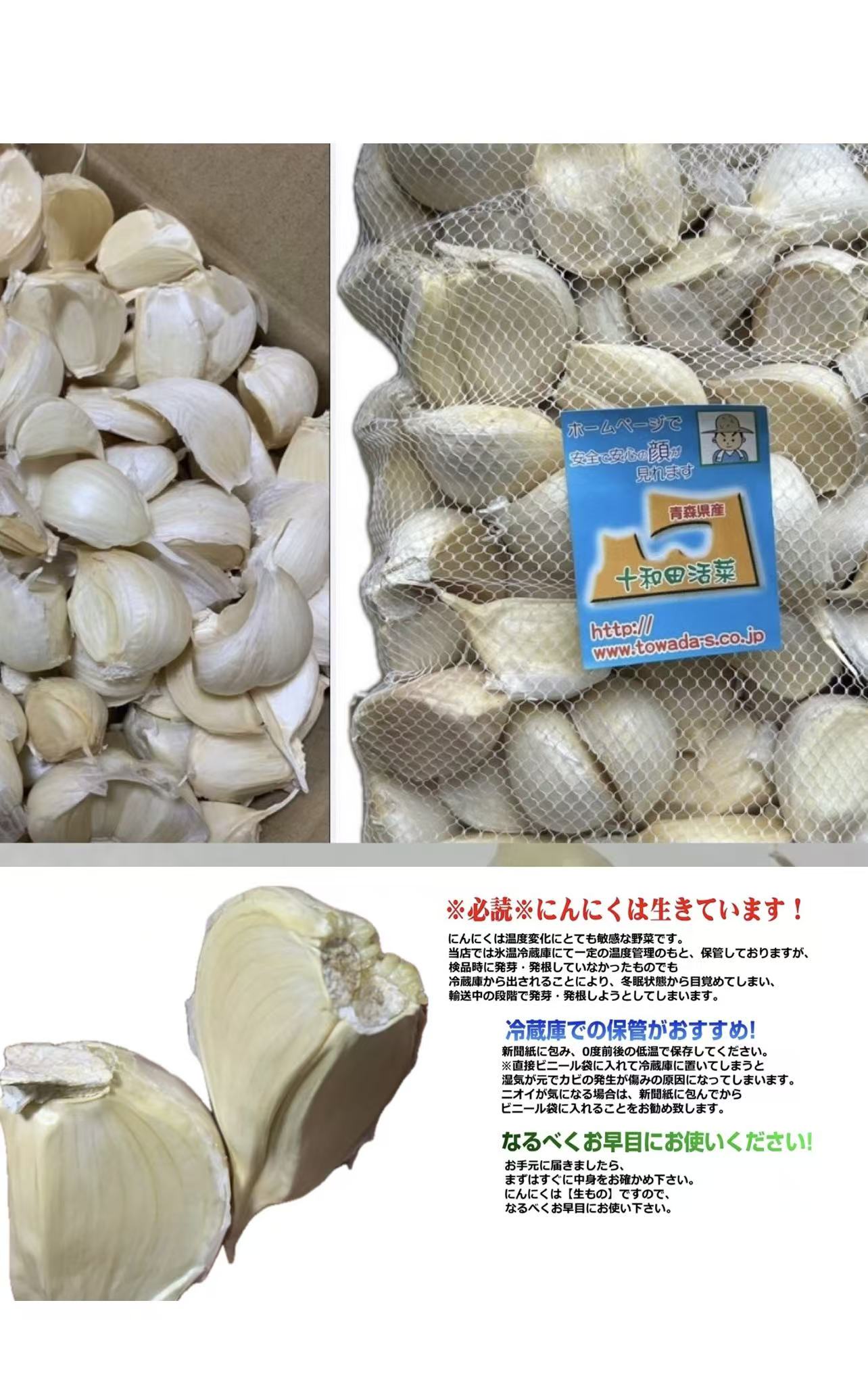 生産地:青森県十和田市及び周辺地域。 商品名:ホワイト六片種にんにく。 バラにんにく2kg 大粒 厳選 大容量のお買い得な商品。 表皮の色について:茶色、黄色みがかったものが含まれている場合がございます。 これは日焼けで着色したものになります。 また、薄紫色になっているものはにんにくに含まれる成分が滲むことで着色した物で、 いずれも内部や品質には全く問題ありませんのでご安心してお召し上がり頂けます。 バラにんにくは、不要な茎や皮を取り除いている為、可食部は約1.2倍。 ロスもゴミも少なく、調理の際に手間が少なく便利です。 茶色・発根・発芽にんにくが混ざる事がございます。ご了承ください。 賞味期限:生ものですのでなるべくお早目にお召し上がりください。 保存は冷蔵庫がおすすめです。 商品お手元に届きましたら、必ず中身をお確かめください。 商品に不備があった場合、商品到着後2日以内にご連絡ください。 画像はイメージです。実際にお届けする商品とパッケージ等が異なる場合がございますので、あらかじめご了承ください。 ☆購入金額3,980円以上で送料無料となります。 ただし、沖縄県と離島に関しては3,980円以上の場合は別途加算送料が発生致します。 メールでご案内いたします。 東北のおいしい食材を産地直送でお届けします。青森県は国内の「にんにく」生産量80%を占める日本一のにんにく生産地です。 十和田市周辺は、肥沃な土壌、厳しい冬の気候を活かした大地の中で、「にんにく」栽培に最も適した地域といわれています。 9ヶ月間にわたり長期間育てた「にんにく」は糖度が高くコクがあります! 当社の商品は、すべて十和田市周辺の農家が丹精込めて育てた「にんにく」です。品質には自信があります。