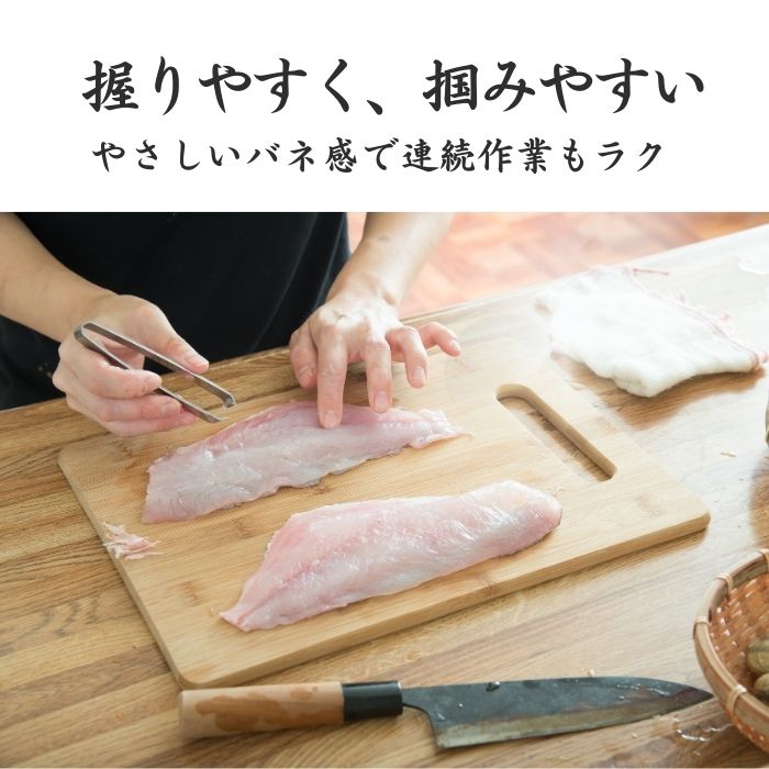 【送料無料★選べる2種】骨抜き ピンセット 島冶郎PRO 骨をつまんで、スッと抜く。 継ぎ目のないオールステンレス製/食器洗い乾燥機OK/新潟県燕三条 日本製。 ポイント ・骨の根元をしっかり掴める形状で、滑りにくい ・握りやすいカーブと適度なバネ感で連続作業もラク ・下処理や皮むき、ラベル剥がしなど多用途に活躍 選べる2タイプ ・斜め型:先端約12mm。骨の根元に差し込みやすく、皮や薄膜もスッと。 ・東型:先端約10mm。直線刃で的確につかみ、スジ取りや細工にも。 使い方の目安 1)骨の向きを指で感じ、根元側から軽く差し込む 2)しっかり掴んで、身を崩さない角度でスッと引く 3)こまめに洗いながら進めると衛生的 スペック 製品サイズ:全長 約105mm 先端幅:東型 約10mm/斜め型 約12mm 材質:ステンレス鋼(オールステンレス構造) 原産国:日本(新潟県燕三条) 食器洗い乾燥機:使用可能 お手入れ 使用後は洗剤で洗浄し、水分を拭き取って乾燥保管してください。 配送について メール便(ポスト投函)でお届け。日時指定・代引き不可。 関連ワード:骨抜き 骨取り ピンセット 魚 骨 抜き ステンレス 日本製 燕三条 プロ仕様 下処理 皮むき 斜め型 東型 料理 調理器具 キッチンツール 食洗機対応