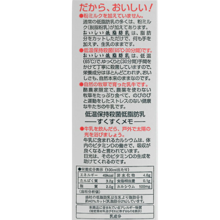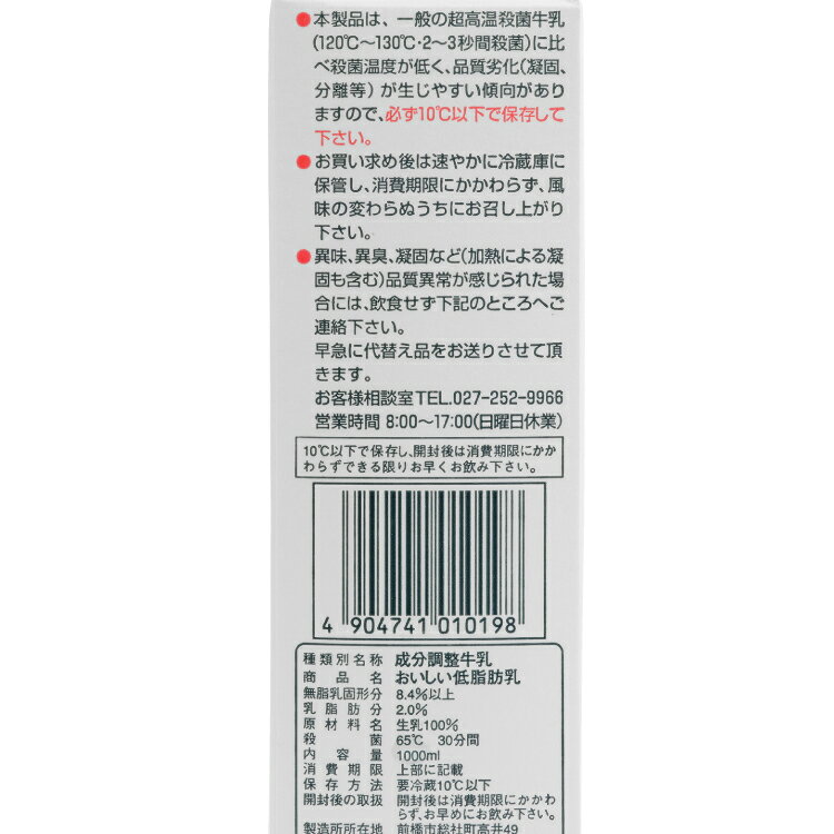 牛乳と変わらないおいしさとヘルシーさを兼ね備えた「低脂肪乳」です。一般的な「低脂肪牛乳」は脂肪分を1.5%以下にしますが、さっぱりし過ぎておいしさが半減してしまいますが、タカハシ乳業の「低脂肪乳」は脂肪分を2.0%にすることで、ふつうの牛乳とほぼ変わらないおいしさでヘルシーな低脂肪を実現しました。低温殺菌ですので生乳の風味もしっかり味わえます。原材料:牛乳内容量:1000ml 数量:10本 製造者:タカハシ乳業