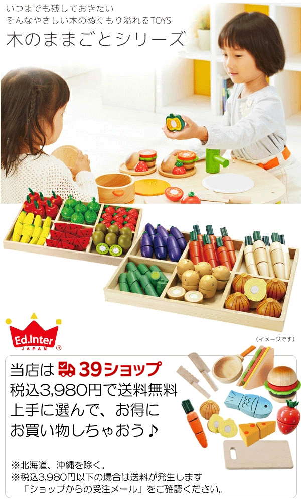 【まとめてお買い上げの送料について】 ご注文時、また楽天市場からの自動配信メールには送料が加算されたり 「・・・・」と表示される場合がございます。 ショップよりお送りする受注メールにて送料無料へ変更させていただきます。 木のぬくもりが人気のエドインターままごとシリーズです。 子どもの「やってみたい!」を叶えてくれる木のままごとあそび マジックテープ式でザクっと切れるリアルな感触が楽しめます。 ごっこあそびが出来るままごとは想像力や感性を養う素敵なおもちゃです。 プレゼントなどにもオススメです♪ 商品スペックーーーーーーーーーーーー <メロン> サイズ:9.5×4.5×4.3cm ーーーーーーーーーーーーーーーーーー ※北海道・沖縄へのお届けは別料金がかかります。