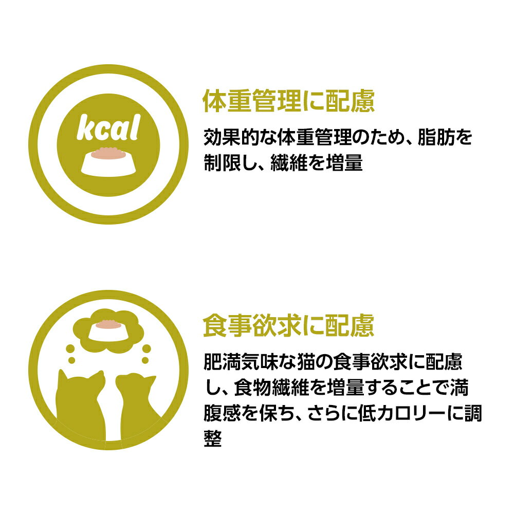 【賞味期限:2027年8月21日以降の商品を出荷させていただきます】 セットでの販売の商品になります。単品での返品は一切お受けしておりません。あらかじめご了承ください。肥満気味の猫のために 体重管理を必要とする肥満気味の猫に配慮し、特別に調製された食事療法食です。 この食事は、体重管理を必要とする肥満気味の猫に配慮し、低カロリー密度でありながら、必要なタンパク質・ビタミン・ミネラルなどが充分に給与できるように調整されています。 ◆体重管理に配慮◆ 効果的な体重管理のため、脂肪※1を制限し、繊維※2を増量しています。 ※1標準的な自社成猫用フードと比較し、約33%減 ※2標準的な自社成猫用フードと比較し、約467%増 ◆食事欲求に配慮◆ 肥満気味な猫の食事欲求に配慮し、食物繊維を増量することで満腹感を保ち、さらに低カロリー※3に調整しています。 ※3標準的な自社成猫用フードと比較し、約14%減 ◆健康な身体の維持に配慮◆ 健康な身体を維持するため、タンパク質※4・ビタミン・ミネラルを調整しています。 ※4標準的な自社成猫用フードと比較し、約29%増 ◆L-カルニチンを配合◆ 健康的な筋肉量の維持のためにL-カルニチンを多く配合しています。 ◆お腹の健康維持に配慮◆ 腸内フローラを整えるため、善玉菌のエサとなる食物繊維(セルロース)、フラクトオリゴ糖を配合。さらに消化吸収の負担が少ない小麦タンパク質分離物(消化率90%以上)を使用し、猫のお腹の健康維持をサポートします。 ※本製品は、国際基準であるGMP・HACCP・ISO9001の認定を受けた工場で、原材料の選定から製造、出荷までの全工程において徹底した品質管理のもと、安定した品質を保つように製造されています。 ■使用上の注意:・本製品はキャットフードです。他の用途に使用しないでください。 ・粒の色やサイズに若干ばらつきがありますが、品質上の問題はありません。 ・粒に見られる黒・褐色の部分は原料由来のものです。 ・給与後、体調が悪化した場合には使用を中止し、獣医師にご相談ください。 ・予告なくパッケージデザイン・内容などが変更になる場合がございます。 ■保管上の注意:・直射日光、高温多湿を避け涼しいところに保管してください。 ・開封後は密閉して冷暗所に保管し、なるべく早く与えてください。 ・乳幼児の手の届かない場所に保管してください。 ■その他注意:・パッケージ記載の給与量は使用開始時の目安です。 ・個体差や活動量に応じて、1日の給与量を1~数回に分けて与えてください。 ・ほかのフードからの切り替えは従来のフードに2割ぐらいを置き換えて与え、徐々に増やしてください。 ・常に新鮮な水を飲めるようにしてください。・獣医師の指導のもとに給与してください。 ■素材・材質:鶏肉、植物性繊維(セルロース繊維)、タピオカ、小麦タンパク質分離物(消化率90%以上)、コーングルテンミール、小麦粉、加水分解鶏肉タンパク、油脂類(動物性油脂(鶏)、魚油)、アミノ酸類(L‐リジン、L‐トレオニン、DL‐メチオニン、タウリン、L‐カルニチン、L‐トリプトファン)、ミネラル類(K、Cl、Ca、Zn、Mn、Fe、Cu、I、Se)、ビタミン類(A、コリン、D3、E、C、ナイアシン、パントテン酸カルシウム、B2、B6、B1、葉酸、ビオチン、B12)、フラクトオリゴ糖、サイリウム、加水分解甲殻類(グルコサミン源)、加水分解軟骨(コンドロイチン源)、酸化防止剤(BHA、没食子酸プロピル)、保存料(ソルビン酸カリウム)、マリーゴールドエキス(ルテイン源) ■成分:●保証分析値たんぱく質:33.0%以上、粗脂肪:8.0%以上、粗繊維:15.0%以下、粗灰分:8.5%以下、水分:6.5%以下●分析値(乾物重量比)タンパク質:36.0%、アルギニン:1.61%、ヒスチジン:0.74%、イソロイシン:1.27%、ロイシン:2.76%、リジン:2.07%、メチオニン+シスチン:1.47%、フェニルアラニン+チロシン:2.54%、トレオニン:1.6%、トリプトファン:0.39%、バリン:1.47%、脂質:10.1%、アラキドン酸:0.03%、α‐リノレン酸:0.18%、カルシウム:1.12%、リン:0.77%、カリウム:0.98%、ナトリウム:0.48%、クロール:1.14%、マグネシウム:0.12%、鉄:237mg/kg、銅:29.6mg/kg、マンガン:28.2mg/kg、亜鉛:240mg/kg、ヨウ素:3.0mg/kg、セレン:0.76mg/kg、ビタミンA:40700IU/kg、ビタミンD:1900IU/kg、ビタミンE:799IU/kg、ビタミンC※:184.42mg/kg、ビタミンK:0.16mg/kg、ビタミンB1(チアミン):57.6mg/kg、ビタミンB2(リボフラビン):76.3mg/kg、ビタミンB5(パントテン酸):82.6mg/kg、ビタミンB3(ナイアシン):267mg/kg、ビタミンB6(ピリドキシン):46.8mg/kg、葉酸:22mg/kg、ビタミンB12:0.19mg/kg、ビオチン:5.76mg/kg、コリン:2700mg/kg、タウリン:0.4%、L‐カルニチン:560mg/kg、オメガ6(リノール酸):2.06%、オメガ3(EPA+DHA):0.11%※ビタミンC誘導体由来 ■代謝エネルギー:329kcal/100g ■内容量:500g×2 ■JANコード:4580298877028 ■原産国:タイ ■メーカー:ベッツワン ■名称:ペットフード ■賞味期限 :パッケージに記載 ■販売者:ペットゴー株式会社 0120-958-046 ■区分:ペットフード ■広告文責:ペットゴー株式会社 0120-958-046 ■更新日時:2026/04/17 18:12:13 <免責事項>本サイ