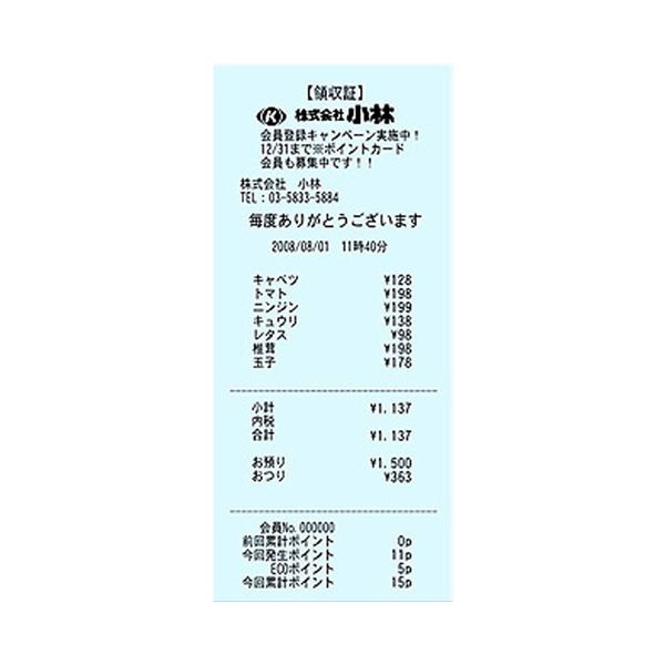 ■サイズ・色違い・関連商品■58mm幅×63m巻 ピンク■58mm幅×63m巻 赤■58mm幅×63m巻 オレンジ■58mm幅×63m巻 クリーム■58mm幅×63m巻 緑■58mm幅×63m巻 青■58mm幅×63m巻 水色【当ページ】■58mm幅×63m巻 紫■58mm幅×63m巻 8色セット■80mm幅×63m巻 ピンク■80mm幅×63m巻 赤■80mm幅×63m巻 オレンジ■80mm幅×63m巻 クリーム■80mm幅×63m巻 緑■80mm幅×63m巻 青■80mm幅×63m巻 水色■80mm幅×63m巻 紫■80mm幅×63m巻 8色セット■商品内容●淡い水色がきれいな58mm幅のレジロールです。●キャンペーン用・販促用に効果的です。●白レシートと比べて目立ちますので、引換券・順番券などに適しています。■商品スペック保存期間の目安:ノーマル保存色:水色材質:国産紙ロール紙サイズ:幅58×直径80mmロール紙長さ:約63m穴内径:12mm厚み:約0.075mm【キャンセル・返品について】商品注文後のキャンセル、返品はお断りさせて頂いております。予めご了承下さい。■送料・配送についての注意事項●本商品の出荷目安は【5 - 11営業日 ※土日・祝除く】となります。●お取り寄せ商品のため、稀にご注文入れ違い等により欠品・遅延となる場合がございます。●本商品は仕入元より配送となるため、沖縄・離島への配送はできません。【 23-400700-08 】