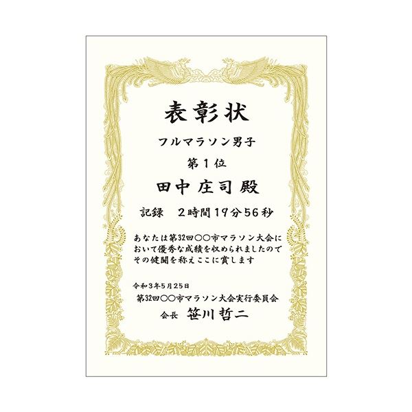 ■サイズ・色違い・関連商品■A4/タテ書用 1セット(25枚:5枚×5パック)■A4/タテ書用 1パック(100枚)■A4/ヨコ書用 1セット(25枚:5枚×5パック)■A4/ヨコ書用 1パック(100枚)■B4/タテ書用 1セット(25枚:5枚×5パック)■B4/タテ書用 1パック(100枚)■B4/ヨコ書用 1セット(25枚:5枚×5パック)■B4/ヨコ書用 1パック(100枚)■A3/タテ書用 1セット(25枚:5枚×5パック)■A3/タテ書用 1パック(100枚)■A3/ヨコ書用 1セット(25枚:5枚×5パック)【当ページ】■A3/ヨコ書用 1パック(100枚)■商品内容●金箔で鳳凰を描いた高級感のある本格賞状の横書き用(縦型)のA3サイズ。5枚×5パックのセットです。●繊細な飾り枠のデザインを金箔で表現しました。●金箔がプリンタに付着しないよう特殊加工を施しています。●気品のある色目にこだわった特漉き用紙を使用しています。●特殊加工を施しているのでレーザープリンタやその他の出力機に対応しています。●従来からの手書きや通常印刷(凸版やオフセット)にも使用できます。■商品スペックサイズ:A3寸法:タテ420×ヨコ297mm色:白材質:ケント紙坪量:209g/m2付属品:テスト印刷用紙1枚その他仕様:●紙厚:0.25mm●金箔押印刷、陳列に便利なヘッダ付袋入備考:※お使いのプリンタが本紙の厚み(0.25mmまたは209g/m2)に対応していますことをご確認の上ご購入ください。【キャンセル・返品について】商品注文後のキャンセル、返品はお断りさせて頂いております。予めご了承下さい。■送料・配送についての注意事項●本商品の出荷目安は【5 - 11営業日 ※土日・祝除く】となります。●お取り寄せ商品のため、稀にご注文入れ違い等により欠品・遅延となる場合がございます。●本商品は仕入元より配送となるため、沖縄・離島への配送はできません。【 10-3081 】