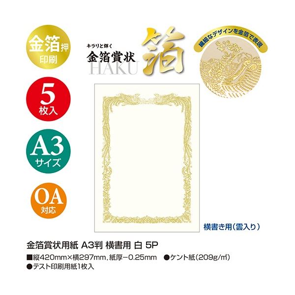 ササガワ タカ印 金箔賞状用紙 白 A3 ヨコ書用 10-3081 1セット(25枚:5枚×5パック)