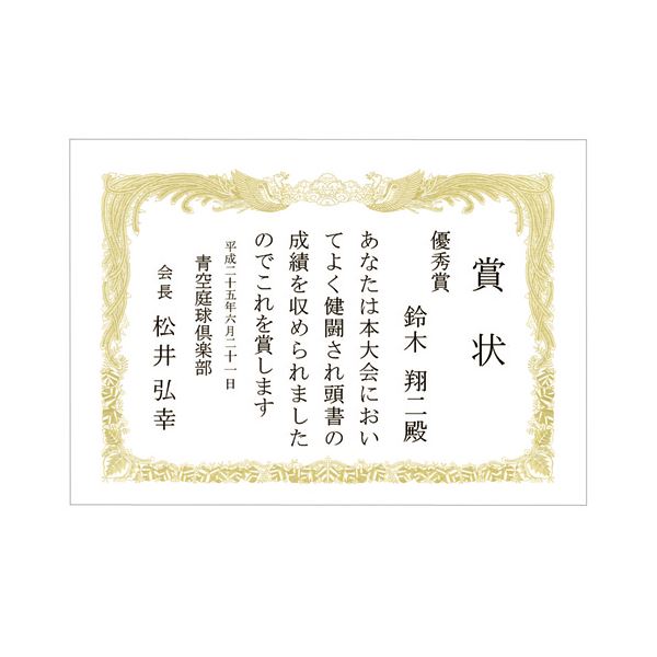 ■サイズ・色違い・関連商品関連商品の検索結果一覧はこちら■商品内容【ご注意事項】・この商品は下記内容×2セットでお届けします。美しい金刷印刷の賞状!!●ホームページからテンプレートを無料でダウンロードできます。■商品スペックサイズ:A4寸法:タテ210×ヨコ297mm色:白材質:上質紙坪量:157g/m2付属品:テスト用紙5枚その他仕様:●タテ書●インクジェット・レーザープリンタ、ワープロ対応●手書き・オフセット印刷にも対応■送料・配送についての注意事項●本商品の出荷目安は【1 - 5営業日 ※土日・祝除く】となります。●お取り寄せ商品のため、稀にご注文入れ違い等により欠品・遅延となる場合がございます。●本商品は仕入元より配送となるため、沖縄・離島への配送はできません。【 TSYW-A4T-100 】