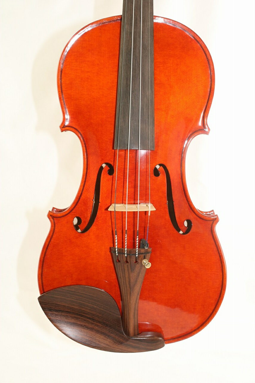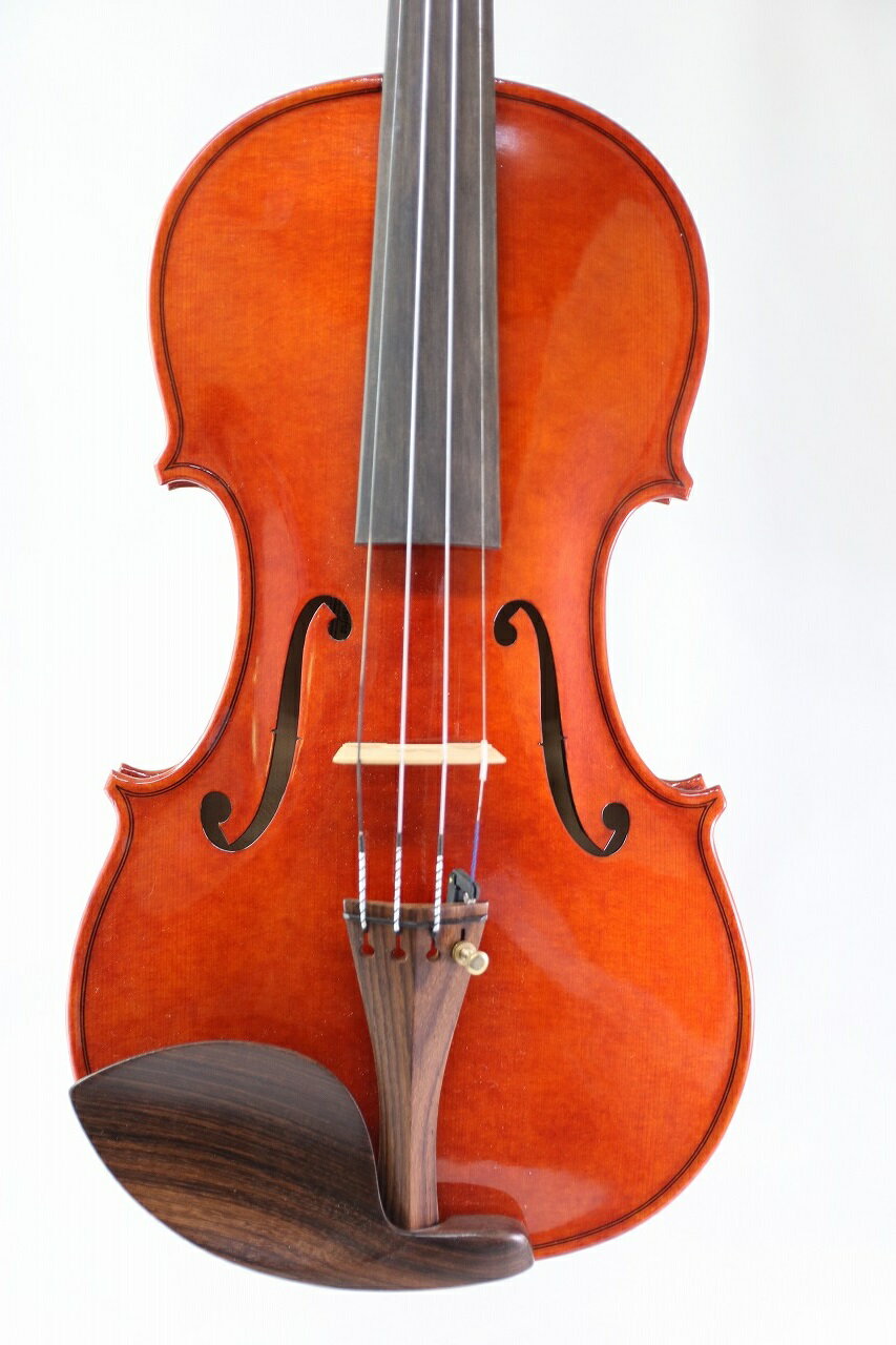 ブルガリア製のハンドメイド、カルネリ・モデルバイオリンです。 製作者:Krasimir Simov (2010年製作、ソフィア) 表板:ギリシア東部とブルガリア南部にまたがるロドピ山脈(Rhodope)から切り出した年月の経た良質なスプルース。ツー・ピース。(ウィキペディア参照 en.wikipedia.org/wiki/Rhodope_Mountains) 裏板:スリベン地方の良質なバルカン・メープル。ツー・ピース。 (ウィキペディア参照 en.wikipedia.org/wiki/Sliven) 側版、渦巻:裏板とマッチングした良質なバルカン・メープル。(スリベン産) ニス:下地はゴールデン。仕上げニスはライト・レッド・オレンジ色。柔らかい良質なニス。 Length: 354mm Upper bouts: 166mm Middle bouts: 112mm Lower bouts: 204mm ペグ、テールピース、エンドピン、顎当てはすべて良質な紫檀(ローズウッド)。 駒はフランスのAUBERT、弦はフランスのCorelliを装着 この製作者の楽器を使って演奏した音源があるのでぜひ最後の写真をクリックして聞いてください!