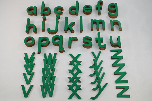 モンテッソーリ 切り抜きアルファベット 小文字 グリーン ♪小、箱なし、文字のみ♪ Montessori Movable Alphabet Lowercase 知育玩具 言語教育 Language 推奨年齢 3歳以上 切り抜いたアルファベット(小文字)です。モンテッソーリ言語教育の代表的な教具です。木製です。 収納箱は付属しておらず、アルファベットのみの販売です。 一文字につき5個入っています。 「a」の大きさは3.1 x 3.5 x 0.2 cmです。 ** 細かなモノや角があるものもありますので、3歳以下のお子様に与える際はご注意くださいませ。親の見守る前で遊ばせるようにしてください。誤飲やケガなどの責任は当店は負えません。免責にご同意いただいたうえでご購入お願い申し上げます。レターパックで発送いたします。