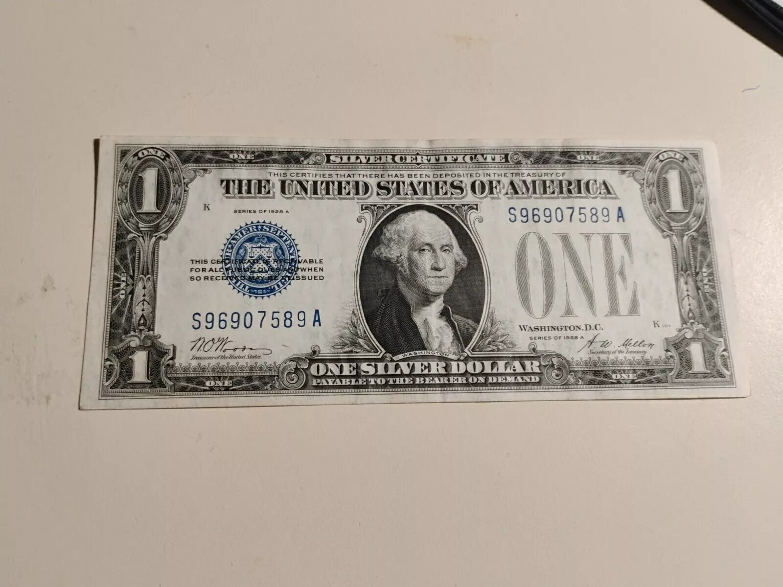 1928A 米ドル 1 ドル銀証紙幣、青いシールと「面白い」裏面付き (レア)