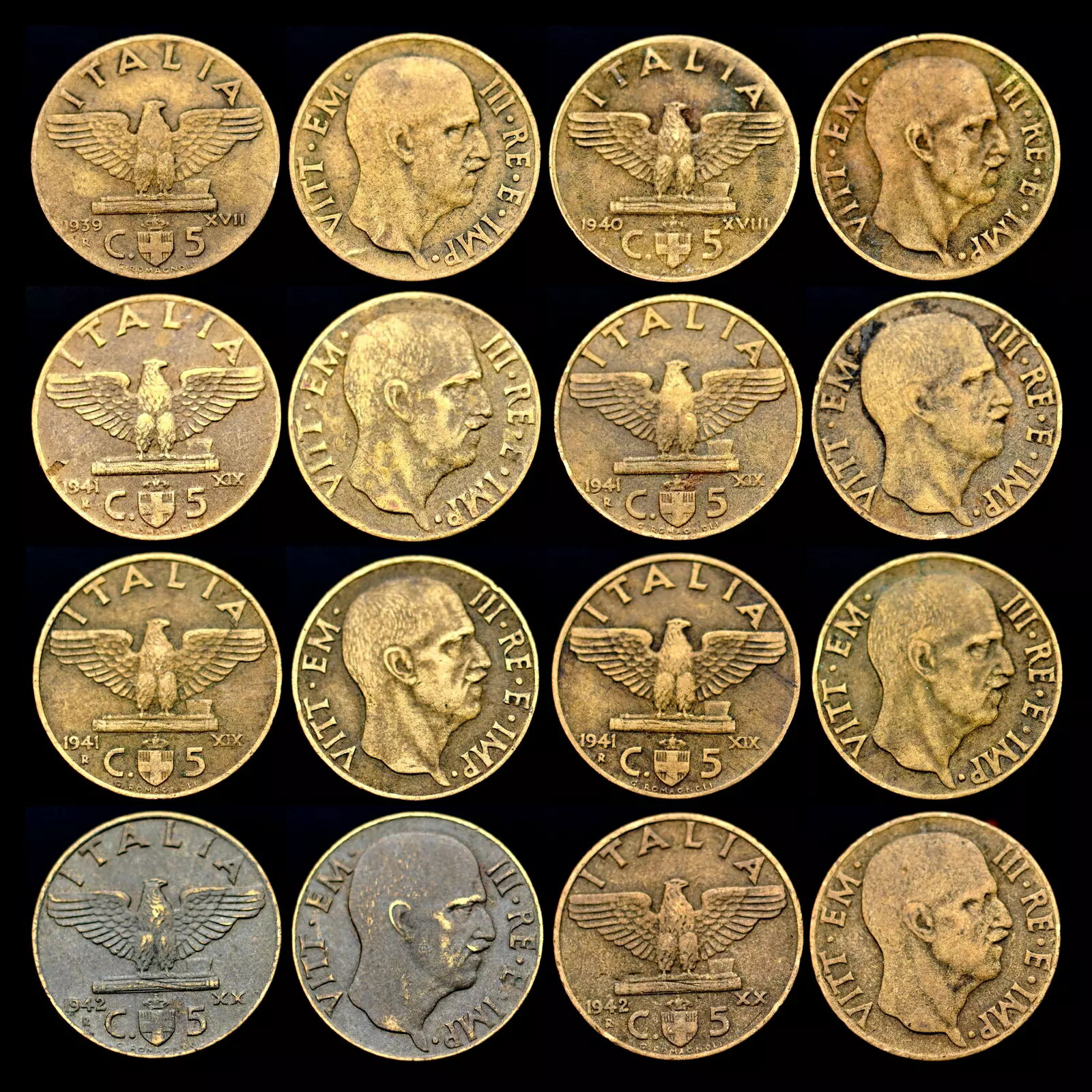 5 Centesimi (インペーロ、アルミニウムブロンズ) - イタリア ヴィンテージ コイン 8 枚セット ????