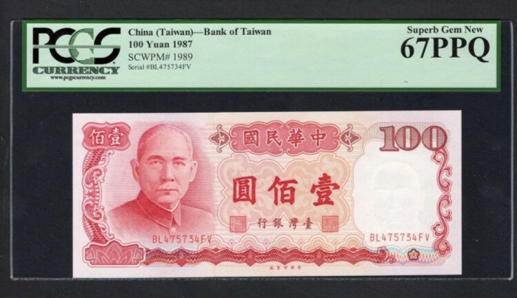 台湾、中国 - 台湾銀行 100元 1987年 P1989 未使用 グレード67