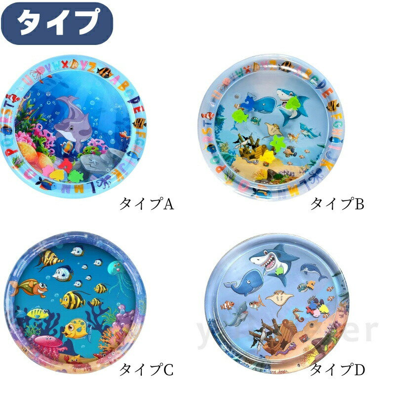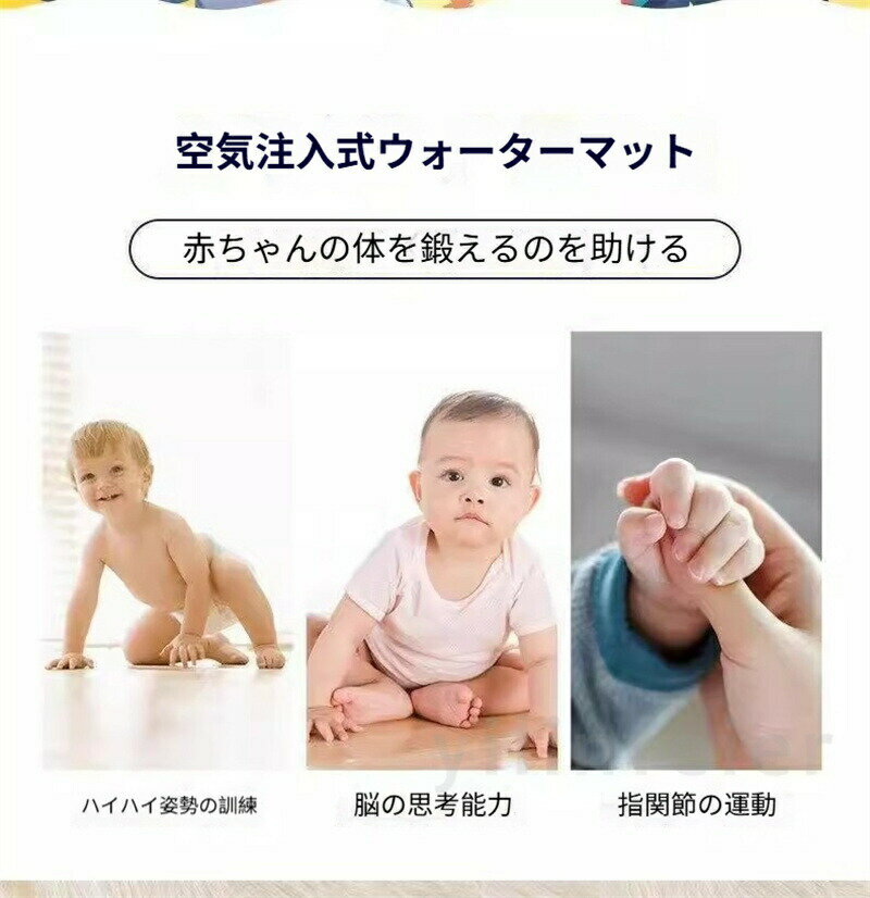 商品内容ウォータープレイマットサイズタイプA60CM タイプB60CM タイプC95CM タイプD95CM特徴萌え造型 × カラフルデザイン:赤ちゃんの “目を奪う” 魔法赤ちゃんの指先が自然に伸びる “探索欲” を刺激し,タッチするたびに親近感を育みます。マット表面の海の動物のカラフルパーツは,赤ちゃんの視覚発達に最適な “高コントラストカラー” を採用。色彩心理学に基づいた配色が,脳神経の結合を促進し,“見る→触れる→追う” という知育サイクルを自然に形成します。特徴タミータイム革命:うつ伏せ練習を “快適” に変える生後 2 ヶ月から推奨される タミータイム(うつ伏せ練習)を支援するデザインが特徴です。水が充填された中央部の“ぷにぷに感触” は,赤ちゃんの胸元をやさしく支え,首を持ち上げる力を養います。特徴ひんやり機能:夏の熱中症を “触感で撃退”注水後のマットは,接触冷感素材の特性で,赤ちゃんの肌表面温度を下げます。特に朝夕の屋外プレイや、冷房の弱い室内でも,“ひんやりとした安心感” が長時間持続し,汗によるベタつきやかぶれを防ぎます。“濡れない” 技術がもたらす “清潔な遊び”マット表面は防水加工で,水が肌に直接触れることなく,“水遊びの楽しさ” と “ドライな快適さ” を両立します。従来の水遊び玩具のように衣類を濡らす心配がなく,室内でも安心して使用できます。注意事項商品写真はできる限り実物の色に近づけるよう徹底しておりますが、 お使いのモニター設定、お部屋の照明等により実際の商品と色味が異なる場合がございます。画像のサイズ表をご参考ください。実物を一つ一つ採寸しておりますので、2〜3センチの誤差が出る場合がございますが、ごください。