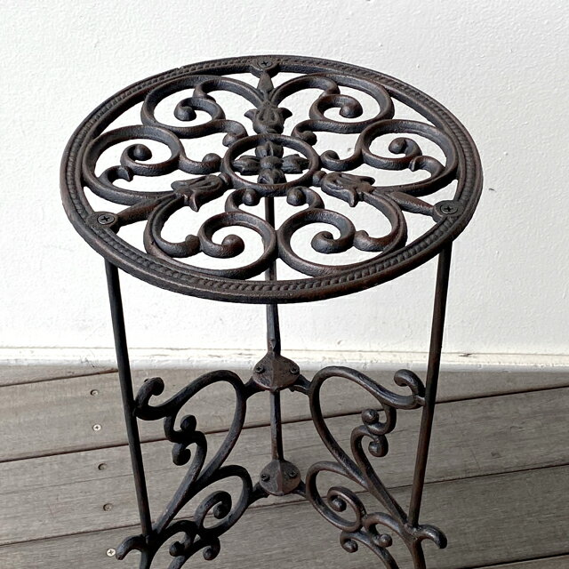 サイズφ28×高さ50.5cm材質アイアンアイアン製なので、どっしりとして安定感があります。グリーンが映えるブラックカラー。天板の模様も素敵です。三本脚で、安定感があります。