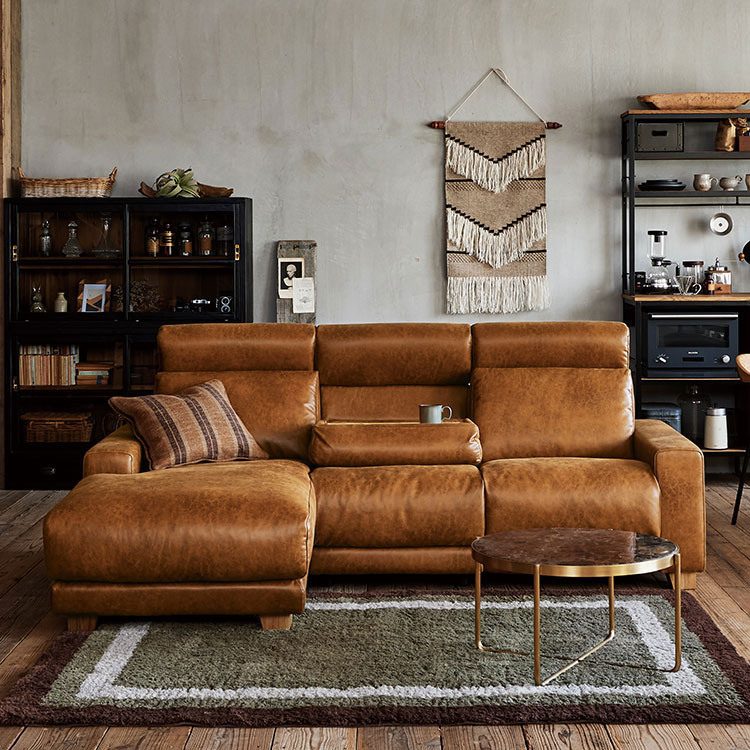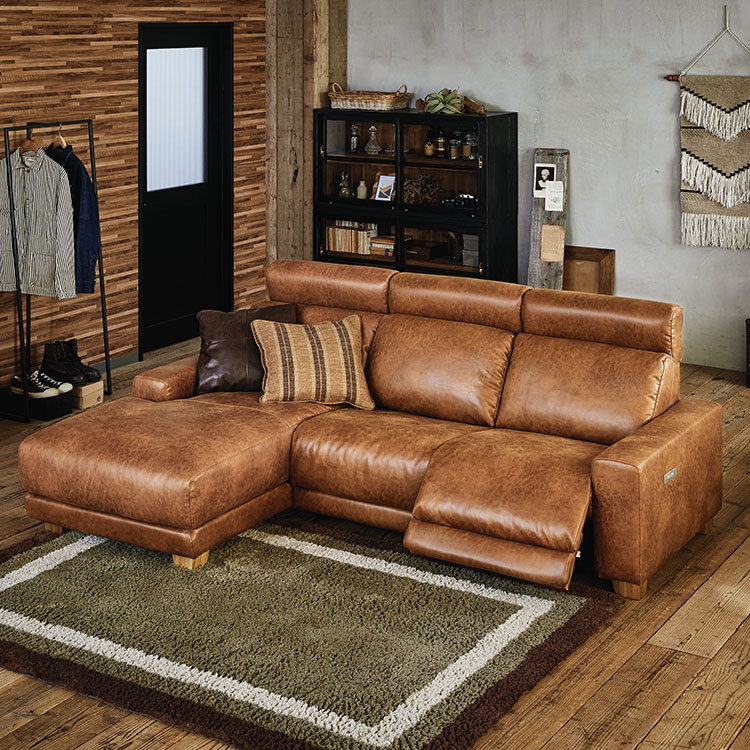 サイズ幅220×奥行154×高さ91(SH43)cm 脚高:7cm材質本体:スーパーレザーテックス/脚:アッシュ材/スチール 内部:フェザー/ウレタンフォーム/Sバネ 本体張り込み仕様 備考組み立て商品(工具あり) ヘッドレスト角度調整・取り外し可。 最大リクライニング角度131度 カウチ左右を選べます。座ったときにカウチ部分がどちらにくるかで左右をお選びください。リクライナー特有の重厚すぎる存在感を払拭するスマートデザイン。真ん中のクッションを倒すと、サイドテーブルに早変わり。肘横のスイッチで、ソファ座から寝姿勢に近いリラックス体勢までスムーズに無段階調整ができます。心地よく沈み込むフェザー入りのクッションです。サイドテーブルにはカップ用の掘り込みを施しています。カウチは左右、お選びいただけます。肘横にリクライニングのスイッチがございます。詳細サイズです。スペースの確認をお願いします。