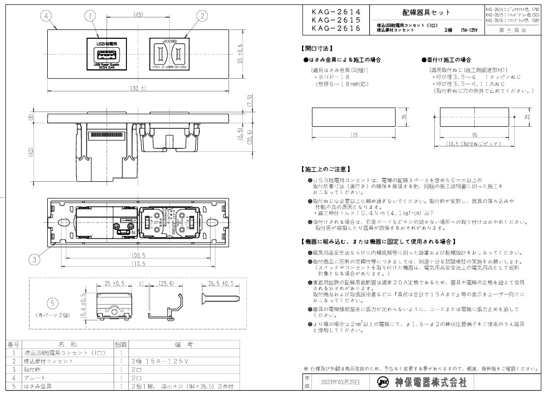 メーカー:JIMBO / 神保電器 シリーズ名:家具・機器用コンセント/スイッチセット 扉付コンセント:15A 125V USB入力:100V-0.5A MAX USB出力:DC 5V 2.4A 適合はさみ金具:BHP-18(同梱) KAGラインアップのセット品には、プレート・はさみ金具が付属しております。 ※受注生産品のためお時間をいただく場合がございます。 ※受注生産品のため、ご注文後の返品・交換・キャンセルは出来ませんのでご了承ください。 関連キーワード 配線器具 埋め込み 取付け枠 取り付け枠 家具用 機器用 什器用 家具コン 家具向製品■特徴 家具や住宅設備など機器用のラインアップです。 ガイドランプ(緑色の表示灯)や、チェックランプ(黄色の通電表示灯)が付いている組み合わせも取り揃えております。 カラーラインアップは、ピュアホワイト(PW)、ソリッドグレー(SG)、ソフトブラック(SB)の3色です。 スイッチを片切として使用する場合は、3路スイッチの0-1 端子に接続してください。 ※受注生産品のためお時間をいただく場合がございます。 ※受注生産品のため、ご注文後の返品・交換・キャンセルは出来ませんのでご了承ください。 ※この商品は電気工事士による取付工事が必要です。資格を有しない一般消費者は、取付・取替工事を行うことは法律上できません。