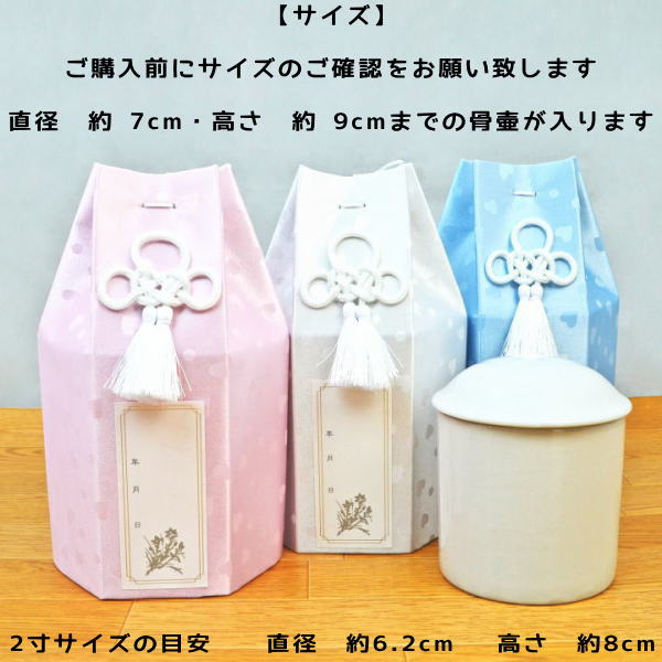骨壷カバー・骨袋のみの販売です。 古くなった骨壷カバー・骨袋の交換にも最適です。 イメージも一新、亡くなったあの子も新しい骨壷カバーを喜んでくれるでしょう。 【サイズ】ご購入前にサイズのご確認をお願い致します 直径 約 7cm・高さ 約 9cmまでの骨壷が入ります。骨壷カバー・骨袋のみの販売です。 古くなった骨壷カバー・骨袋の交換にも最適です。 イメージも一新、亡くなったあの子も新しい骨壷カバーを喜んでくれるでしょう。