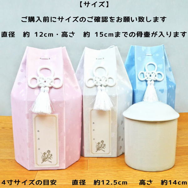 骨壷カバー・骨袋のみの販売です。 古くなった骨壷カバー・骨袋の交換にも最適です。 イメージも一新、亡くなったあの子も新しい骨壷カバーを喜んでくれるでしょう。 【サイズ】ご購入前にサイズのご確認をお願い致します 直径 約 12cm・高さ 約 15cmまでの骨壷が入ります。骨壷カバー・骨袋のみの販売です。 古くなった骨壷カバー・骨袋の交換にも最適です。 イメージも一新、亡くなったあの子も新しい骨壷カバーを喜んでくれるでしょう。