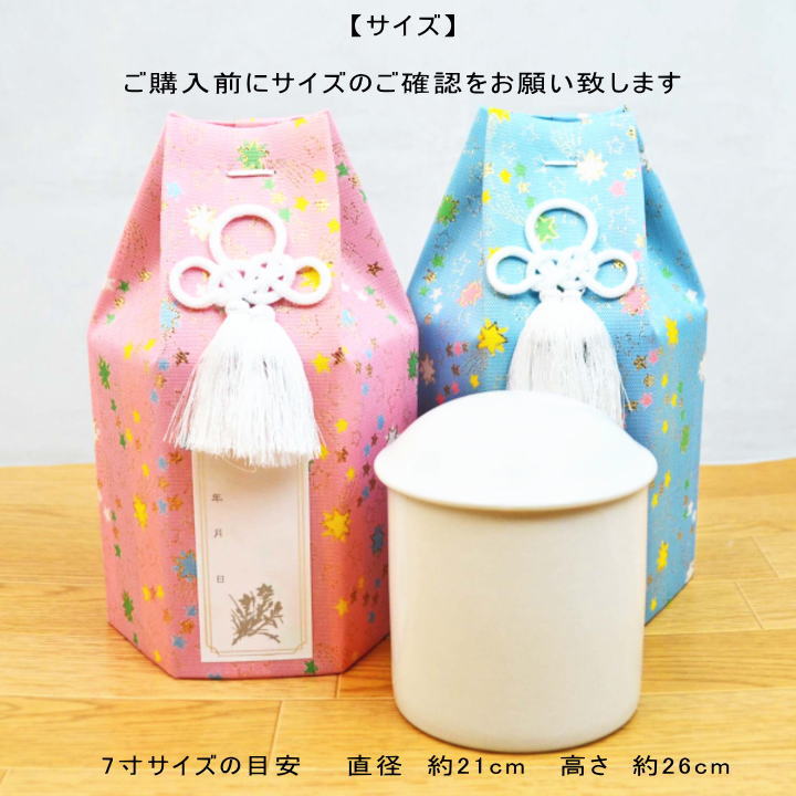 骨壷カバー・骨壷袋のみの販売です。 古くなった骨壷カバー・骨袋の交換にも最適です。 イメージも一新、亡くなったあの子も新しい骨壷カバーを喜んでくれるでしょう。 【サイズ】ご購入前にサイズのご確認をお願い致します 7寸サイズの目安 直径 約21cm 高さ 約26cm骨壷カバー・骨袋のみの販売です。 古くなった骨壷カバー・骨袋の交換にも最適です。 イメージも一新、亡くなったあの子も新しい骨壷カバーを喜んでくれるでしょう。