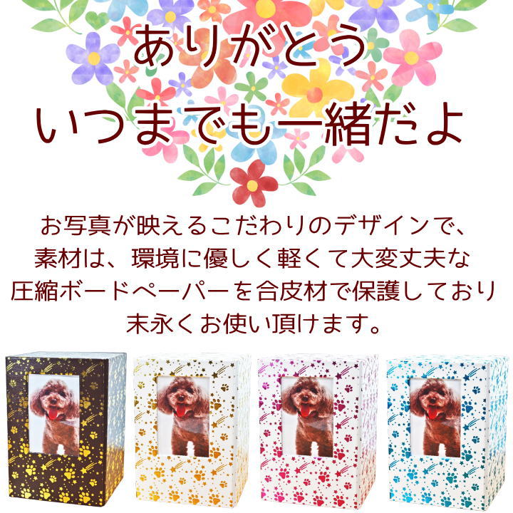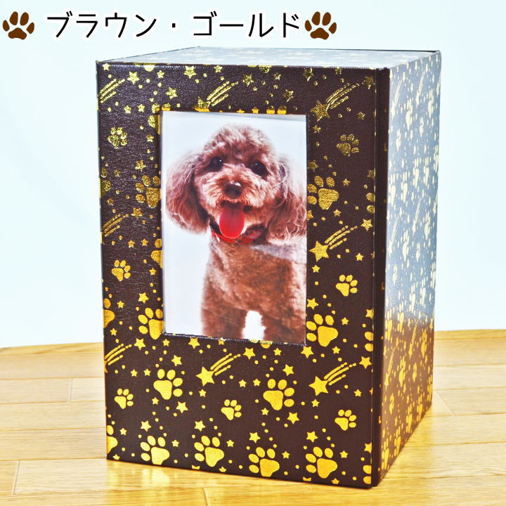 大切なペットちゃんのお写真が飾れて、4寸までの骨壷が納められる新しいスタイルの骨壷カバー(ケース)です。(上部から差し込み式でお写真の入替可能です) 4寸までの骨壷を開き扉の内側へ大切に納めることが出来、ご自宅や納骨堂に置いても違和感なく愛着をもってご供養して頂けます。 ペットちゃんのお写真が映えるこだわりのデザインで、素材は、大変丈夫な圧縮ボードペーパーを合皮材で保護しており安心してお使い頂けると、ペット霊園様でも話題の骨壷カバーです。 【ご注意】ご購入前にサイズのご確認をお願い致します