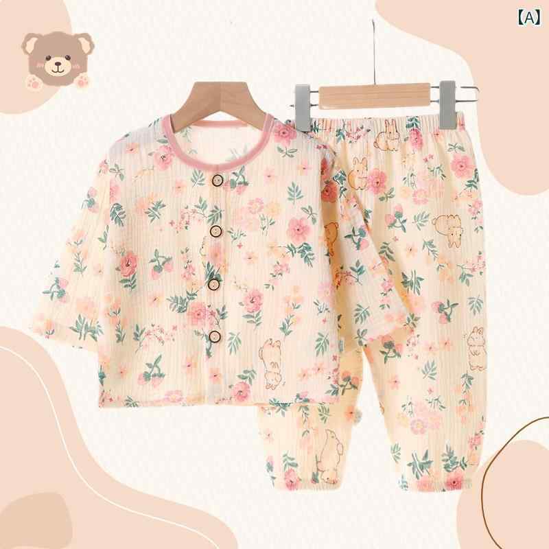 キッズパジャマ 男の子 女の子 ベビー 男女兼用 綿100% ダブルガーゼ 薄手 吸水速乾 通気性 ルームウェア 長袖 かぼちゃパンツ 総柄 部屋着 寝間着 春夏