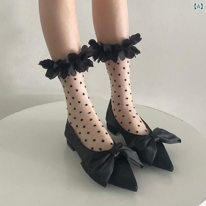 ソックス レディース 春夏 薄手 シアー 透け感 メッシュ 水玉 ストライプ柄 レースフリル ミドル丈 クルーソックス ナイロン 滑り止め 摩擦防止 かわいい おしゃれ ブラック ホワイト