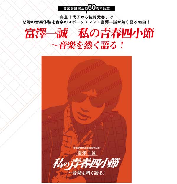 製品仕様 品番 DQCL-3616 セット内容 2枚組CD(全42曲)、歌詞ブック44ページ、半生記64ページ 発売日 2021年7月20日 JANコード 4560427462196 発売元 ソニー・ミュージックダイレクト音楽評論家活動50周年を記念して選曲した珠玉の42曲 富澤一誠 私の青春四小節 音楽を熱く語る CD2枚組 DQCL-3616 島倉千代子から佐野元春まで 怒涛の音楽体験を音楽のスポークスマン・富澤一誠が熱く語る42曲! 音楽のスポークスマンとしてインターネット、テレビ、ラジオ、有線放送、新聞、雑誌等さまざまなメディアで活躍を続ける音楽評論家・富澤一誠氏の活動50周年記念企画となるCDブック『富澤一誠 私の青春四小節~音楽を熱く語る!』が2021年7月20日に発売された。この企画は2冊のブックレットと2枚のCDのセットで、今年70歳を迎えた富澤氏の半生を約4万5000字にわたって綴った一冊と、島倉千代子から佐野元春に至る42曲について、氏の怒濤の音楽体験を交えて熱く語ったコメントを掲載した歌詞ブック、そしてその42曲を収録したコンピレーションCDで構成、そのキャリアを音と文字で立体的に浮き彫りにしていく。1950年代の流行歌に始まり、60年代の青春歌謡とカバーポップス、70年代のフォークソング&ニューミュージックを経て、氏が現在提唱している“エイジフリーミュージック(良質な大人の音楽)”の新曲まで、富澤氏ならではの視点で体感できる「聴いた、見た、感動した」日本のポップス70年史。ぜひお手元に置いていただきたい。 収録内容 【Disc-1】青春歌謡、カバーポップス&エイジフリーミュージック 1.からたち日記/島倉千代子* 2.お富さん/春日八郎* 3.チャンチキおけさ/三波春夫* 4.達者でナ/三橋美智也* 5.潮来笠/橋 幸夫* 6.高校三年生/舟木一夫 7.君だけを/西郷輝彦 8.美しい十代/三田 明* 9.潮風を待つ少女/安達 明 10.霧の中の少女/久保 浩 11.素敵なやつ/叶 修二 12.青春の城下町/梶 光夫 13.湖愁/松島アキラ 14.若いふたり/北原謙二 15.月影のナポリ/森山加代子* 16.パイナップル・プリンセス/田代みどり* 17.可愛いベイビー/中尾ミエ* 18.砂に消えた涙/弘田三枝子 19.千の風になって/秋川雅史 20.吾亦紅/すぎもとまさと 21.愛のままで…/秋元順子 22.どこで暮らしていても/さくまひでき 【Disc-2】フォーク&ミュージック 1.どうにかなるさ/かまやつ ひろし 2.私たちの望むものは(シングル・バージョン)/岡林信康 3.今日までそして明日から/吉田拓郎 4.カレーライス/遠藤賢司 5.人生が二度あれば/井上陽水 6.学生街の喫茶店/ガロ 7.雪/猫 8.春夏秋冬(実況録音盤)/泉谷しげる 9.少女/五輪真弓 10.神田川/かぐや姫 11.精霊流し/グレープ 12.岬めぐり/山本コウタローとウィークエンド 13.結婚するって本当ですか/ダ・カーポ 14.夕暮れ時は淋しそう/N.S.P 15.白い冬/ふきのとう 16.『いちご白書』をもう一度/バンバン 17.季節の中で/松山千春 18.関白宣言/さだ まさし 19.昴-すばる-/谷村新司 20.SOMEDAY/佐野元春 *印:放送音源(モノラル)
