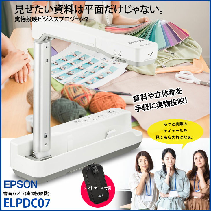 ELPDC07は電源不要なコンパクト書面カメラ。 USBケーブルで、セッティングがスピーディー。 電源ケーブルが不要。PCやプロジェクターにUSBケーブルで接続するだけなので、スピーディーにセッティングが完了。立体物の投写が簡単に行えます。ジェクターを使用できるので、授業や会議を中断することなく、すぐにプロジェクターが利用できます。 平面だけでなく立体の資料も投影可能! 学校やビジネスにも使い道が広がります。 商品説明 メーカー EPSON 商品名 型式 ビジネスプロジェクター ELPDC07 カラー ホワイト 撮像範囲 最大275×491mm 撮像素子 1/2.7型CMOS 約200万画素 撮像速度 最大15フレーム/秒 ズーム 最大8倍デジタルズーム 有効画素数 水平1920ドット×垂直1080ドット 撮影レンズ F=2.8 フォーカス AF/マニュアル 照明 LED×2 100lx アナログRGB出力 - コンポジットビデオRGB出力 - 電源 USBバスパワー 消費電力 2.5W 質量 約1.0kg 外形寸法 W260×D76×H60mm(収納時) W260×D76×H388mm(セットアップ時) 出力端子 USB端子タイプB マイク 内蔵マイク OS Windows Mac 状態と保証 商品の状態 中古品のため箱はありません。外観は問題なく良好です。 付属品 フトキャリングケース/USBケーブル(3m) 保証 当店保証 保証3ケ月