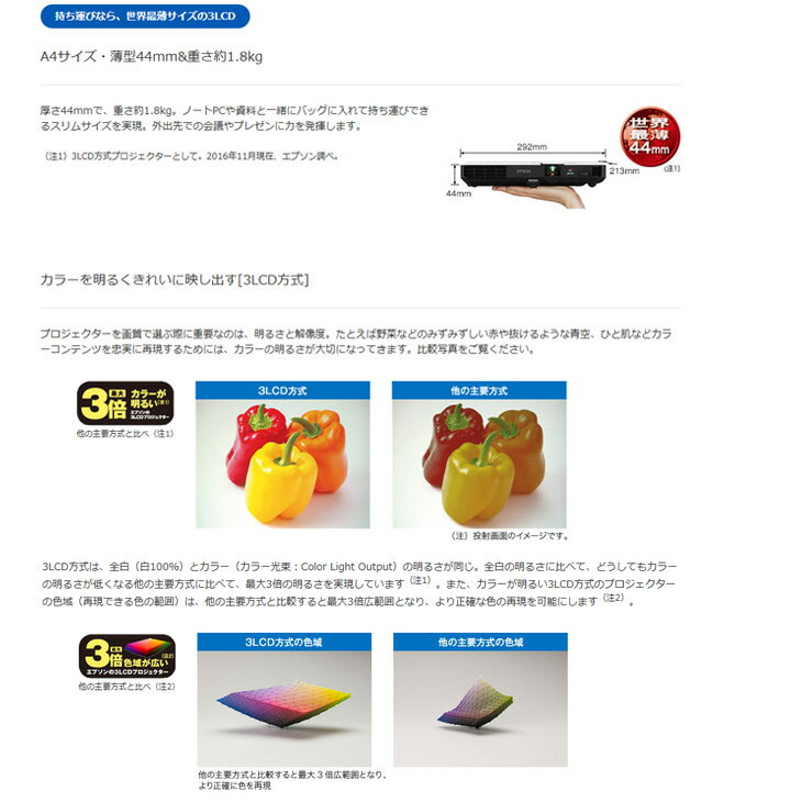 世界最薄(発売時)の厚さ44mm、重さ約1.8kgのコンパクト設計で、ートPCや資料と一緒に持ち運びできる、モバイルモデルのビジネス向けプロジェクター。 「ピタッと補正」(フレームフィット機能/自動タテヨコ補正)により、どこでもすぐにプロジェクターを使用可能。 スクリーンミラーリングに対応。スマートフォン・タブレット・ノートPCからフルHD映像をワイヤレス投写できる。 商品説明 メーカー EPSON 商品名 EB-1795F 解像度 VGA〜WUXGA 方式 3LCD方式(3原色液晶シャッター式投映方式) 有効光束(白の明るさ:lm) 3200lm カラー光束(カラーの明るさ:lm) 3200lm 液晶パネルサイズ 0.61型 液晶パネル画素数 1920x1080×3 色再現性 フルカラー(10億7000万色) RGB信号対応解像度 アナログ・デジタル:UXGA、SXGA+、SXGA、WXGA+、WXGA、XGA、SVGA、VGA ビデオ対応信号 NTSC/PAL/SECAM 走査周波数 アナログRGB:15~92kHz、50~85Hz/デジタルRGB:15~75kHz、24/30/50/60Hz 消費電力 ノーマル:309W/エコ:217W/ネット監視時:×/待機時:0.18W 映像入出力端子 IN:ミニD-Sub 15pin、RCA、HDMI/MHLOUT:- 外形寸法 292x44x213mm(突起部含まず) 質量 約1.8kg 状態と保証 商品の状態 良品:中古品です、小キズや擦れ・黄ばみなどはありますが、全体的に まずまずな商品で、動作快適品となります。 是非ご検討ください。 付属品 ACケーブル(100V日本国内専用)、リモコン、HDMIケーブル、ソフトケース 保証 中古パソコン 保証3か月