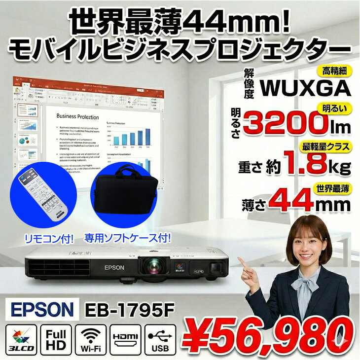 【中古】EPSON 液晶プロジェクター EB-1795F 3200lm 解像度VGA〜WUXGA 3LCD方式 1.8kg リモコン/ケース付:良品