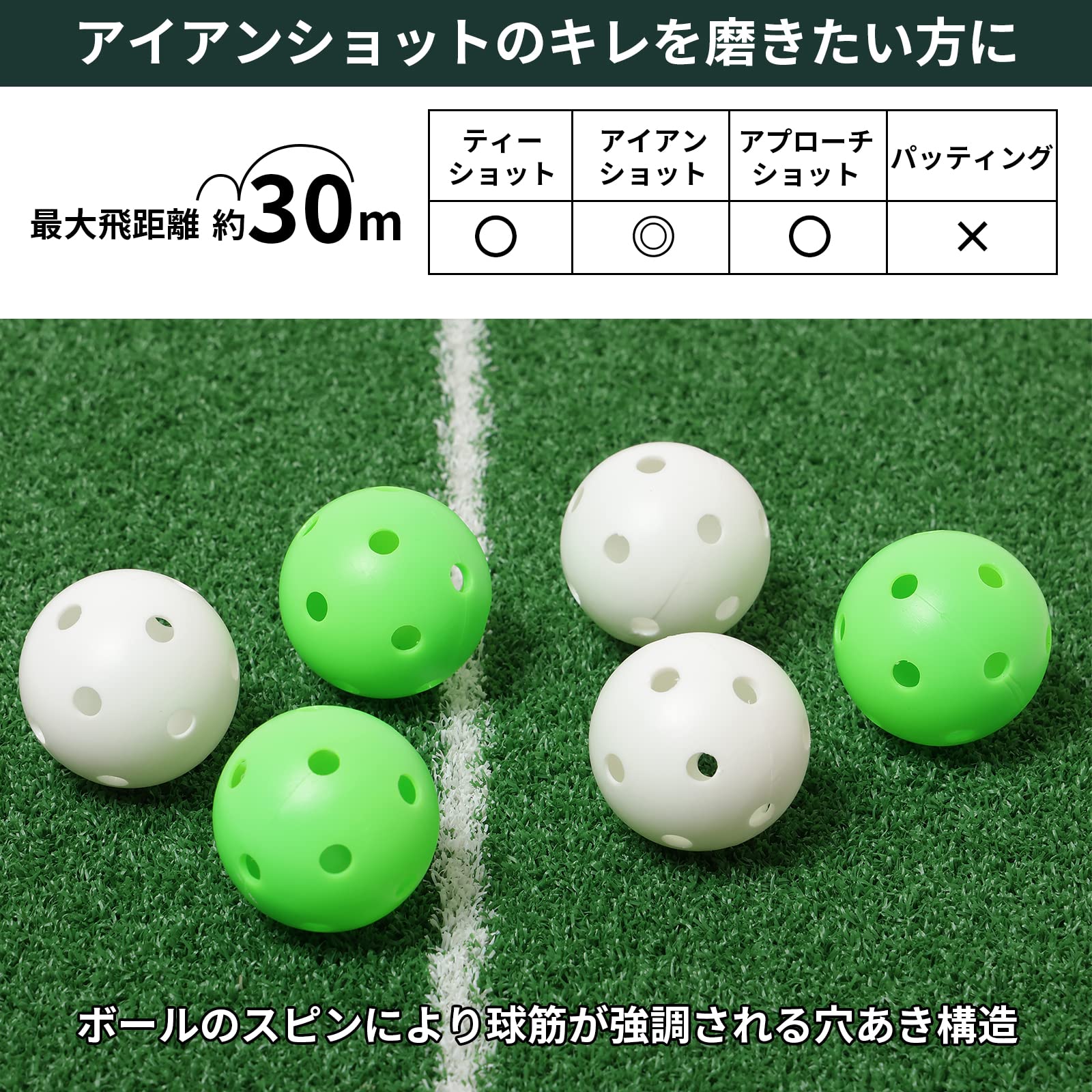 商品情報商品の説明アイアンショットのキレと冴えを磨くのにおすすめの練習用ボール 穴あき構造でスピンによる球筋を強調 最大飛距離:約30m主な仕様 ゴルフ練習用ボールbr最大飛距離 約30mbrアイアンショットの練習に最適brボールのスピンにより球筋が強調される穴あき構造brアイアンショットのキレと冴えを磨くのにおすすめ