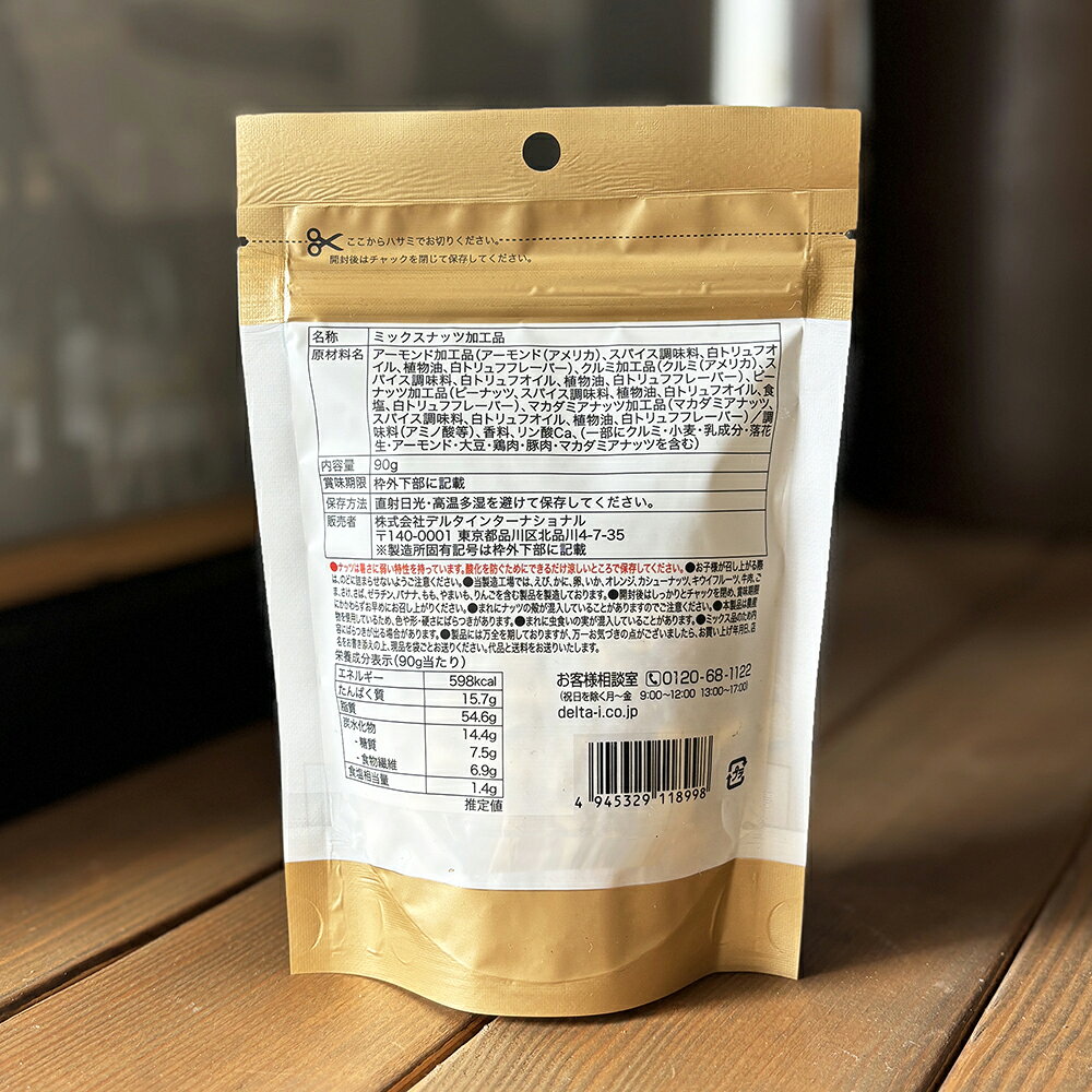 白トリュフ薫る、香り高いプレミアムな一品。四種類のミックスナッツ。 原材料名 アーモンド加工品(アーモンド(アメリカ)、スパイス調味料、白トリュフオイル、植物油、白トリュフフレーバー)クルミ加工品(クルミ(アメリカ)、スパイス調味料、白トリュフオイル、植物油、白トリュフフレーバー)、ピーナッツ加工品(ピーナッツ、スパイス調味料、植物油、白トリュフオイル、食塩、白トリュフフレーバー)、マカダミアナッツ加工品(マカダミアナッツ、スパイス調味料、白トリュフオイル、植物油、白トリュフフレーバー)/調味料(アミノ酸等)、香料、リン酸Ca 内容量90g送料込でお得な12コ売りはこちら