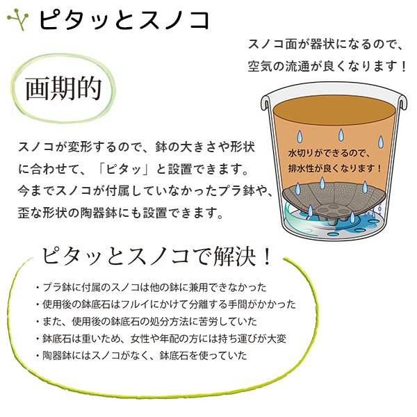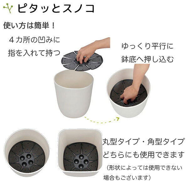 画期的!スノコが変形するので、鉢の大きさや形状に合わせて、「ピタッ」と設置できます。いままでのスノコが使えなかった陶器鉢や歪な形状の植木鉢にも設置できます。スノコ面が器状になるので、通気と通水が良くなります!ピタッとスノコで解決!・プラ鉢に付属のスノコは他の鉢に兼用できなかった・使用後の鉢底石はフルイにかけて分離する手間がかかった・また、使用後の鉢底石の処分方法に苦労していた・鉢底石は重いため、女性や年配の方には持ち運びが大変・陶器鉢にはスノコがなく、鉢底石を使っていた使い方は簡単!・4カ所の凹みに指を入れて持つ・ゆっくり水平に鉢底へ押し込む丸型タイプ・角型タイプのどちらにも使用できます。(形状によって使用できない場合もございます)●23型(2枚組):234φ×20(mm)/対応ポットサイズ=7号〜9号鉢●33型:335φ×35(mm)/対応ポットサイズ=10号〜12号鉢※23型は2枚組、33型は1枚組となります材質:ポリプロピレン検索ワード:すのこ 簀の子 簀子 ポット 鉢 インドアグリーン 黒