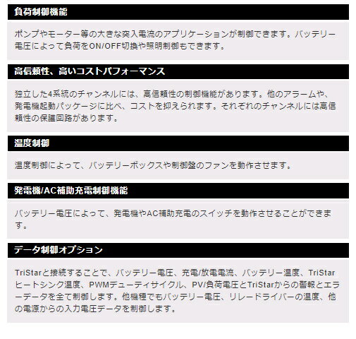 商品情報メーカー名DENRYO製品種類太陽電池コントローラオプション商品型番RD-1RD-1 電菱(DENRYO) 太陽電池コントローラオプション メーカー直送、メーカーからのサポートを受けることができます。 RD-1 太陽電池コントローラオプション複数のコントローラと連動することが可能独立した4系統のリレー制御を行う産業用アプリケーションに使用可能なアラーム出力機能負荷制御機能温度制御機能発電機/AC補助充電制御機能データ制御オプション有適用機種:SolarAmp MPPTProStarProStar MPPTTriStarTriStar MPPTTriStar MPPT 600VMeterHub・代引可 メーカー廃盤、欠品の可能性もあります。その場合、キャンセルまたは納期をご相談させて頂きます。※北海道、沖縄、離島は、別途送料が発生する場合がございますので、お問い合わせください。 10