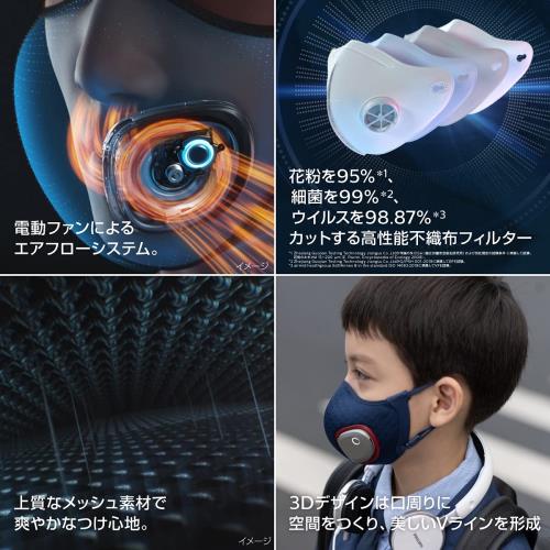 子どもの暑さ対策に、 フレッシュな空気を。 3段階のファンで常にフレッシュな空気を供給。夏場でも蒸れないので活発なお子さまに最適。 花粉・ウイルス対策に! 暑い季節汗をかいても、内部のフィルターを交換し、マスクカバーを洗浄すれば、いつでもフレッシュに使用いただけます。(フィルターの交換方法、マスクカバーの洗浄方法は取扱説明書をご確認ください。) ヘッドループを使用することでズレにくくなり、耳が痛くならないので長時間の装着も快適に。 ひもに強い力が加わると簡単にはずれるクイックリリース機能。 最大3時間のバッテリー駆動で長時間の外遊びにも対応。 おしゃれ好きな子にもうれしいスタイリッシュなデザイン。 大人用と同じデザインなので親子でおそろいマスクも!