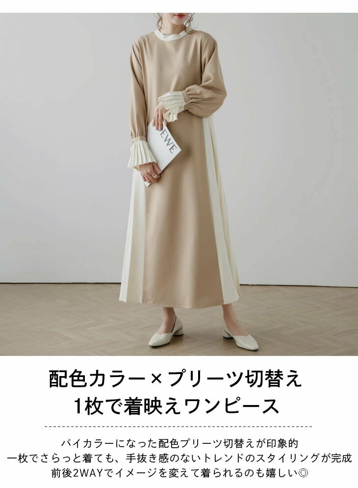 プリーツ切替ワンピースWAY ロング バイカラー リボン 大人可愛い 長袖 レディース おすすめ おしゃれ フリーサイズ秋冬新作 メ込