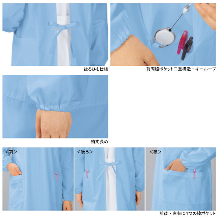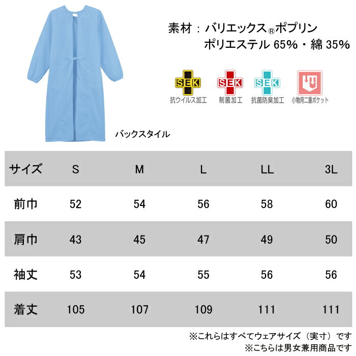 商品説明●オールシーズン用●素材/バリエックスポプリン65%綿35%●機能:抗ウイルス加工、制菌加工、抗菌防臭加工、小物用二重ポケット、ひも仕様、袖丈長め、前両脇ポケット二重構造・キーループ、両脇ポケット●サイズ:S、M、L、LL、3L●カラー:ホワイト、サックス商品仕様ウイルスから身を守る抗ウイルス加工予防衣。ウイルス対策予防衣。着脱しやすい後ろひも仕様。袖丈長めでしっかりガード。前側のポケットのみ二重構造(内ポケット仕切/右2本、左1本で小物収納の便利性がアップ。右ポケット内には鍵などを取り付けられる便利なループ付き。