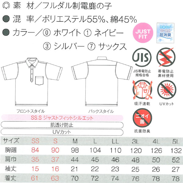 適応サイズ表(cm) 胸廻肩巾袖丈着丈SS84351561S90371663M98442170L104452272LL1104623743L1204825764L1265026785L132522778SS.Sジャストファットシルエット商品詳細メーカー名CO-COS品番【作業服】ビズポロ半袖 A-277商品名【CO-COS】【作業服】ビズポロ半袖 A-277素材フルダル制電鹿の子混率/ポリエステル55%、綿45%サイズSS・S・M・L・LL・3L・4L・5L特徴1、襟配色2、左胸ペン差し付ポケット3、裾スリット4、JIS帯電防止規格合格5、帯電防止素材使用6、吸汗速乾7、UVカット8、肌透け防止カラー0、ホワイト・1、ネイビー・3、シルバー・7、サックス肌透け防止加工などのマルチな7つの機能搭載!適応サイズ表(cm) 胸廻肩巾袖丈着丈SS84351561S90371663M98442170L104452272LL1104623743L1204825764L1265026785L132522778SS.Sジャストファットシルエット商品詳細メーカー名CO-COS品番【作業服】ビズポロ半袖 A-277商品名【CO-COS】【作業服】ビズポロ半袖 A-277素材フルダル制電鹿の子混率/ポリエステル55%、綿45%サイズSS・S・M・L・LL・3L・4L・5L特徴1、襟配色2、左胸ペン差し付ポケット3、裾スリット4、JIS帯電防止規格合格5、帯電防止素材使用6、吸汗速乾7、UVカット8、肌透け防止カラー0、ホワイト・1、ネイビー・3、シルバー・7、サックス こちらは【4L】の販売ページです。【S〜3L】はこちら!