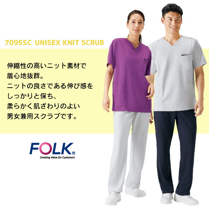 フォーク ニットスクラブ 白衣 医療 看護師 歯科衛生士 薬剤師 理学療法士 介護士 整体師 獣医 クリニック 整骨院 メディカル メンズ レディース 制服 ユニフォーム グレー ターコイズ ネイビー パープル 3S SS S M L LL 3L 4L FOLK fo-7095sc