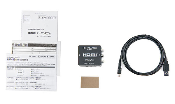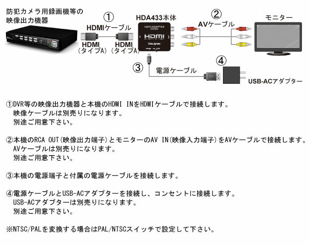 HDMIの映像/音声信号をRCAに変換! ダウンスキャンコンバーター HDA433-D HMDI出力しかない機器の映像をRCA端子のモニターで表示できる! Feature 1 HDMI信号をRCAに変換 HDMIのデジタル映像・音声信号をアナログ信号に変換してRCA出力しますので、RCA映像・音声入力を搭載した多くのモニターに接続する事が可能です。 Feature 2 さまざまな解像度に対応 HDMI映像信号の解像度は480P/576P/720P/1080i/1080Pに対応しております。 ※HDMI信号はすべて60Hz、HDCP対応、HDMI1.3対応(3D映像は非対応)です。 Feature 3 NTSC/PAL信号に対応 NTSC/PAL信号の出力をスイッチで選択する事が出来ますので、海外のPALのモニターにも表示する事が出来ます。 接続例 付属品 HDA433D 仕様 入力 HDMI (タイプA) ×1系統 出力 RCA端子×1系統(映像/音声) 電源 DC5V 消費電流 最大約220mA 寸法 約61(W)×54(H)×20(D)mm 保証 1年間 ※外観及び仕様は予告なく変更することがあります。