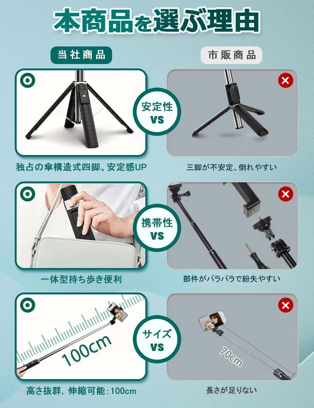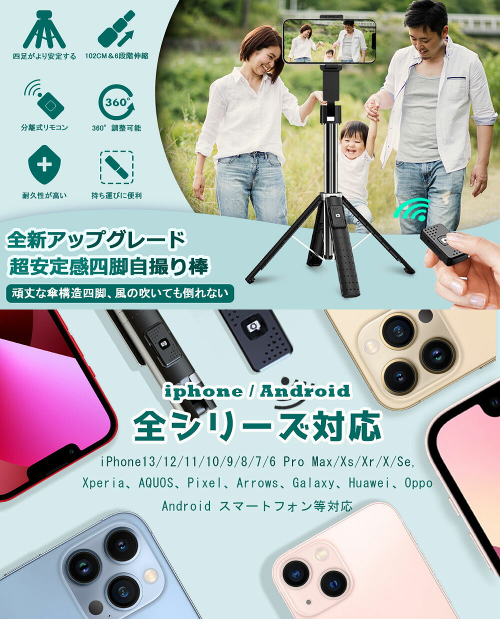 【商品仕様】 型番:P04 製品材質:ステンレス鋼+ ABS 梱包サイズ:195*34*48mm カラー:ブラック、ホワイト 伸縮範囲:19〜100cm 本体重量:195g バッテリー:ボタン電池(CR1632) 対応機種:Android4.2.2・iOS5.0以上、幅62〜90cm(ケース含む)スマホに適応 リモコン最大操作距離:約10m 【パッケージ内容】 自撮り棒本体(リモコン付き)×1 日本語取扱説明書×1 充電ケーブル×1 ※ご注意:パケージデザインは予告なし変更する場合がございます。予めご了承ください。 🌸【業界新開発超安定型四脚自撮り棒】市販の自撮り棒を詳細に分析した結果、三脚型は不安定で倒れやすく、脚が壊れやすい問題がありました。一年にわたる入念な準備の後、ついにこの頑丈な傘構造四脚セルカ棒を開発しました。自撮り棒と頑丈な傘構造四脚は一体化になるデザインし、手持ちの使用だけではなく、スマホから離れた場所や大人数の集合写真も撮影可能な自立タイプとしても使えます。四本の脚に亜鉛合金製の補助バーを備え、頑丈で耐久性が高く、最大荷重30kg、底部は滑り止めゴム素材の使用で、風が吹いていても、不安定な岩場、起伏のある地面などの滑りやすい環境でも安定した撮影ができます。 🌸【分離式リモコン付き】本体に取り外し可能なBluetoothリモコン付きます。リモコンとブルートゥースの繋がりの手順は簡単で、使用可能なデバイスから"VIP"を選択し、接続可能です。リモコンはセルカ棒から外せるし、Bluetoothリモコンの適用範囲は最大10メートルです。初期設定のペアリングを一度設定すれば自動接続してくれるのでとても便利です。自撮りだけでなく、ビデオ通話、旅行、屋外、動畫鑑賞、会議などにも最適です。リモコン内蔵の120mAボタン電池で何万枚の写真撮影に対応、電池は百円ショップやコンビニなどご購入できます。(IOS 5.0以降のiPhone、あるいはAndroid 4.2以降のBluetooth4.0のスマホに対応します) 🌸【6段自由伸縮&自由に角度調節】長さは19cmから100cmまで6段階伸縮可能、お好みの長さが調節できます。水平360°x上下270°回転でき、縦位置と横位置で撮影することができます。普段撮れない角度から撮影するのが魅力的です。お好みの角度に調節と姿勢を自由に探す、クオリティーの高い写真が撮れます。簡単には脱落しません。しっかり携帯を守れる自撮り棒です。 🌸【軽量で頑丈&持ち運びに便利】収納後の長さはわずか19cm、重さは200gと軽量のパラソルよりも軽いので、女性やお子様でも楽に撮影できます。バッグやポケットに入れれば、本当に持ち運びが便利です。自宅、ピクニック、花見、パーティー、いつでもどこでもあなたの美しさを記録することができます!小さなサイズなのにとても役に立ちます。長さは19cmから100cmまで6段階伸縮可能、棒の長さを変えることで、写真に収まる人数も変わってきます!自撮り棒の収縮部分は丈夫なステンレス鋼が採用され、軽便のうえに、優れた高硬度と耐久性を持っています。 🌸【幅広い用途】スマホ対応機種&サイズ:幅6.2cm〜9.4cmまでAndroid&iPhoneの端末に対応できます、各種スマートフォンをしっかり固定できます。通常サイズのスマホはむろん、iPhone13/12/11/10/9/8/7/6 Pro Max/Xs Max/Xs/Xr/X/Se, Xperia、AQUOS、Pixel、Arrows、Galaxy、Huawei、Oppo Android スマートフォン等対応。 【重要】注意事項(ご購入前に必ずお読みください。) ※本商品は、電波法令で定められている技術基準に適合していることを証明する技適マークが貼付されていない無線機器であり、日本国内で使用する場合は、電波法違反になるおそれがございます。ご使用の際には、十分ご注意いただきますようお願いいたします。詳しくは、最寄りの総務省総合通信局へお問い合わせください。 ※【バッテリー体積エネルギー容量不足400Wh/L】 ※商品画像のカラーはイメージであり実際の色と異なる場合がございます。また、モニターにより色が異なる場合がございます。 ※入荷時期により製品のデザインや仕様などが予告なく変更される場合がございますので、予めご了承ください。 ※北海道、沖縄、離島地域は送料別となります。