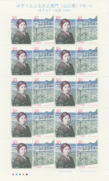 【ふるさと切手】 みすゞとふるさと長門(山口県) 金子みすゞ生誕100年 80円切手 平成15年(2003年)発行 中国-32【切手シート】