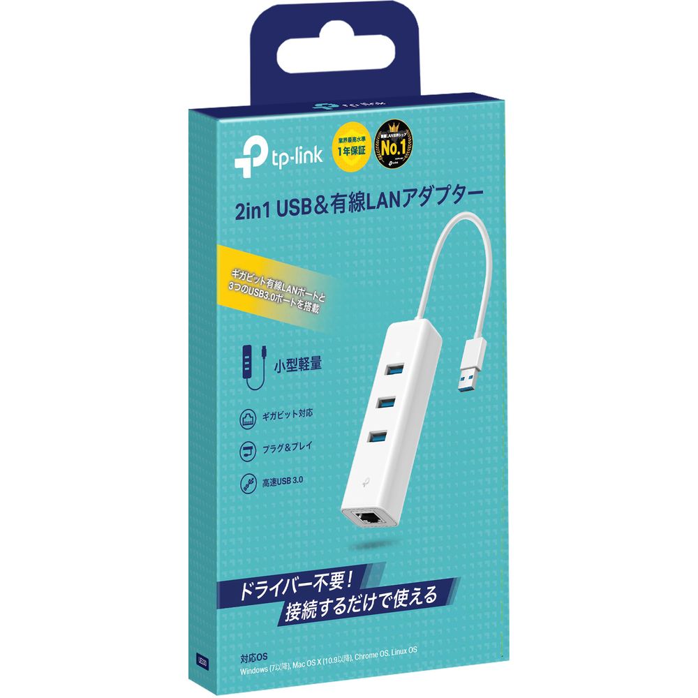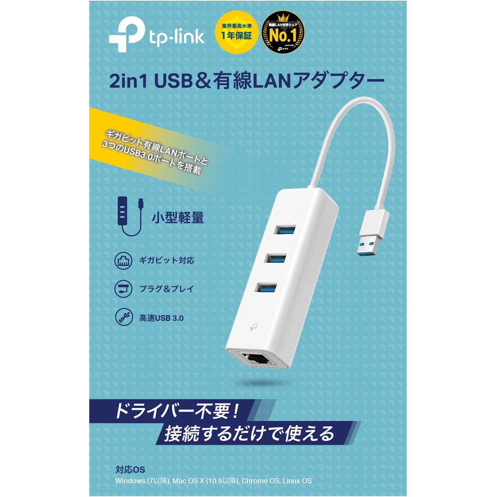 【メーカー名】TP-Link(ティーピーリンク)【商品名】「UE330 JP」 2in1 USB&有線LANアダプタ(USB 3.0ポート×3+ギガビットポート×1搭載)【発売日】2017年4月12日【仕様】標準保証内容1年機種/メディア- [ZZZZ] / - [9Z]商品サイズ横 31.0mm × 高さ 96.0mm × 奥行 23.0mm商品重量50gパッケージサイズ横 10.3cm × 高さ 16.0cm × 奥行 2.6cmパッケージ重量100g【特長】●3つの USB 3.0ポートを追加、最大5Gbpsの転送速度に対応、USB 2.0と比較して10倍の高速性 ・最大1000Mbpsの転送速度をサポートするギガビット イーサネット ネットワーク接続機能を追加 ●小型軽量 ●プラグ&プレイ ●安定性と互換性を強化