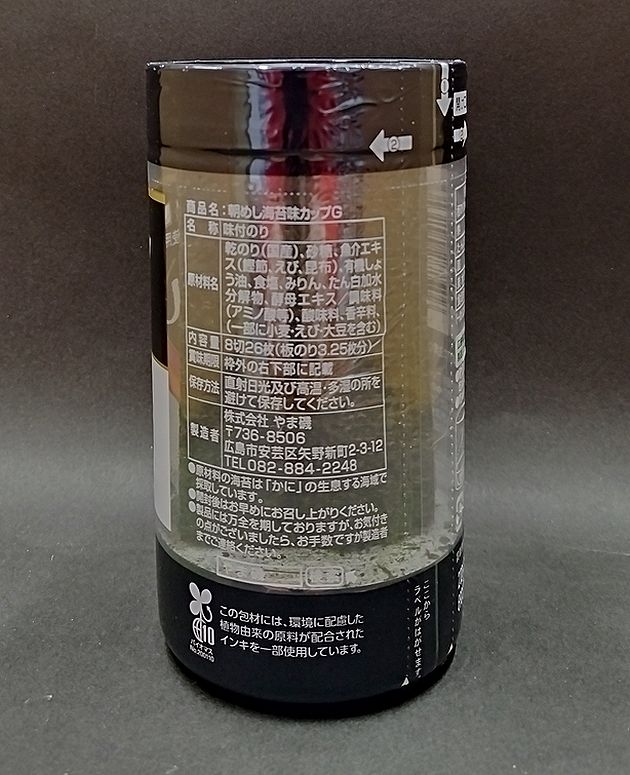 商品明細 名称 味付けのり 内容量 8切れ26枚(板のり3.25枚)x3 原材料 乾のり(国産)、砂糖、魚介エキス(鰹節、えび、昆布)、有機しょう油、食塩、みりん、たん白加水分解物、酵母エキス/調味料(アミノ酸等)、酸味料、香辛料、(一部に小麦・えび・大豆を含む) 賞味期限 15ヶ月 保存方法 直射日光を避けて常温で保存すること。開封後はなるべく早くお召し上がりください。 製造者 株式会社 やま磯 商品説明 パリッとした食感の国産海苔を使用。 有機丸大豆醤油使用のたれで調味したコクと旨味のある味付海苔です。 必要な枚数だけ取り出せ、保管も簡単な卓上容器入りです。 同梱可 同梱可能商品はこちらです 産地直送品および、冷凍商品との同梱包はできません。その場合送料を二個口頂くようになりますのでご注意ください。