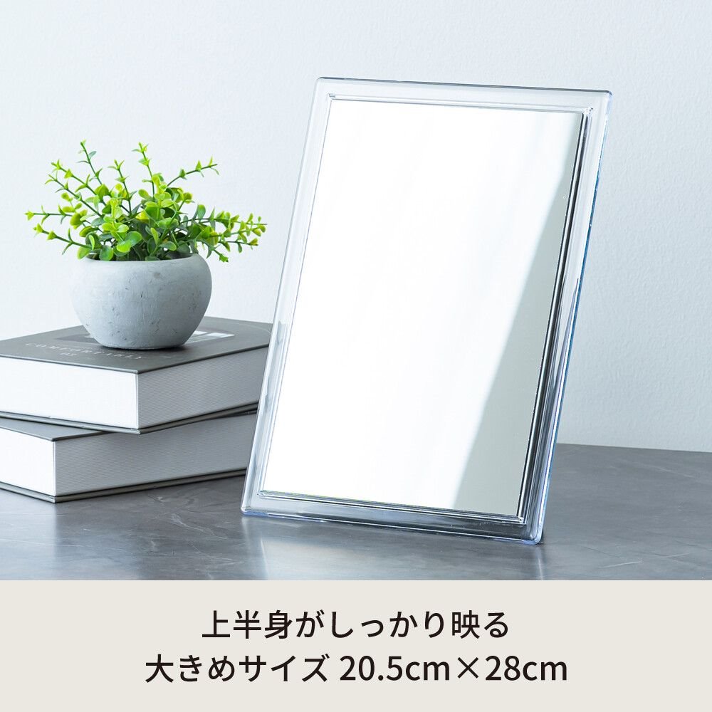 ※モニターにより、色の見え方が実際の商品と異なる場合ございます。商品情報商品名スクエア卓上ミラー CLEAR(クリア) [鏡 スキンケア メイク 化粧]メーカー永井興産 規格/品番 NK-262CR サイズ ●サイズ(約):幅20.5×奥行2×高さ28cm(折りたたみ時) 重量/容量 ●重量(約):0.4kg おすすめ ●透明感が美しいクリアフレームの卓上ミラー●クリアな輝きはモダンで洗練されたイメージに●フレームはガラスより軽く、割れにくく丈夫で耐久性に優れています●どんな空間でもなじみやすいのも嬉しいポイントです●ステイを動かして好みの角度に調節できます●使わないときは折りたたんで収納可能●裏面には壁掛け用のフック穴がありウォールミラーとしても◎ 仕様 ●生産地:中国●材質:PS樹脂・ミラー(2mm厚)●クリアフレーム●角度調節可能●飛散防止効果あり●壁掛けできるフック穴付 梱包サイズ