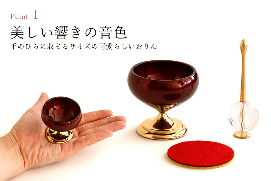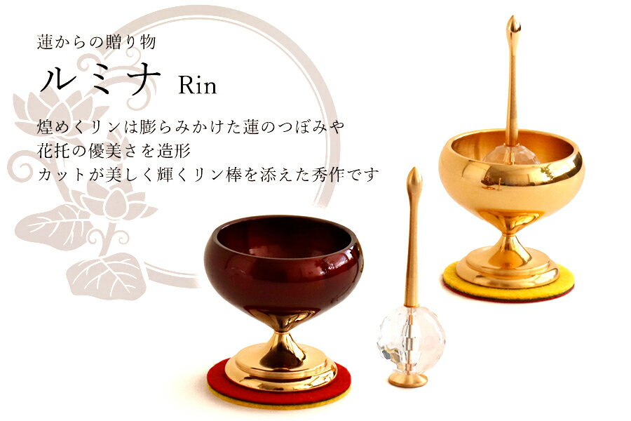 商品詳細 モダンなデザインのおりんセット 高級感溢れるおりんセット 膨らみかけた蓮のつぼみや花托の優美さを造形した煌めくリンは、小さなお仏壇や手元供養にオススメ。手のひらに乗るコンパクトなサイズでありながら、デザイン性が高く、高級感溢れるおりんセットです。 丁寧なつくり お好みのカラーでお使いいただけるよう赤と黄色のリバーシブルになったフェルトの敷物1枚と、カットが美しく輝く専用のりん棒が付属。りん棒は自立式で、裏には置き場所を傷つけないよう底に布が貼ってあります。 モダンなデザイン りん棒はおりんの中に立てて一体型とした省スペースでも利用可能。通常通りおりんとりん棒を並べて利用することもでき、祀り方に合わせてそのカタチを変化させることができます。 選べる2色 ワインゴールドとゴールドの2種類から、お好みのお色をお選びいただけます。 セット内容 おりん ・おりん敷き(赤・黄リバーシブル) ・りん棒 サイズ おりん:高さ5.1 幅5.4 おりん敷き:直径5 りん棒:長さ7.8 幅2.5モダンなデザインのおりんセット 高級感溢れるおりんセット 膨らみかけた蓮のつぼみや花托の優美さを造形した煌めくリンは、小さなお仏壇や手元供養にオススメ。手のひらに乗るコンパクトなサイズでありながら、デザイン性が高く、高級感溢れるおりんセットです。 丁寧なつくり お好みのカラーでお使いいただけるよう赤と黄色のリバーシブルになったフェルトの敷物1枚と、カットが美しく輝く専用のりん棒が付属。りん棒は自立式で、裏には置き場所を傷つけないよう底に布が貼ってあります。 モダンなデザイン りん棒はおりんの中に立てて一体型とした省スペースでも利用可能。通常通りおりんとりん棒を並べて利用することもでき、祀り方に合わせてそのカタチを変化させることができます。 【セット内容】 おりん ・おりん敷き(赤・黄リバーシブル) ・りん棒 【サイズ 約(cm)】 おりん:高さ5.1 幅5.4 おりん敷き:直径5 りん棒:長さ7.8 幅2.5