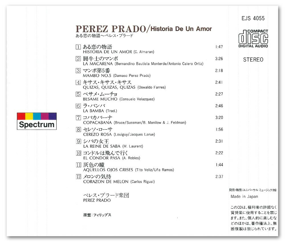 ◆ 商品説明 マンボの王様 ペレス・プラードのラテン・ベスト・セレクション! ■仕様:CD ■品番:EJS-4055 ■JAN:4988005910387 ■発売日: ■発売元:<収録曲>1.ある恋の物語 2.闘牛士のマンボ 3.マンボ第5番 4.キサス・キサス・キサス 5.ベサメ・ムーチョ 6.ラ・バンバ 7.コパカバーナ 8.セレソ・ローサ 9.シバの女王 10.コンドルは飛んで行く 11.灰色の瞳 12.メロンの気持 ■解説付き 登録日:2022/05/30< 注 意 事 項 > ◆おまけカレンダーに関する問合せ、クレーム等は一切受付けておりません。 絵柄はランダムとなります。絵柄の指定は出来かねます。 予めご了承ください。