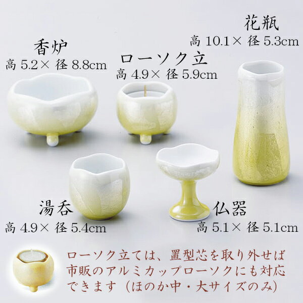 ほのか九谷銀彩 佛具5点セット イエロー 中仏具 仏壇 国産 ペット仏具 お盆 お彼岸 【おまけ付き】 送料無料