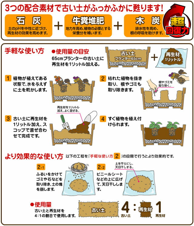 古い土に混ぜるだけふっかふかによみがえる 特徴 ■一度使った土に混ぜるだけで手間をかけません。 ■市販の用土に混ぜても地力がさらにアップします。 ■複数の有機質素材を配合し、土を柔らかく、排水性を良くします。 ■混ぜた直後に植え付けが可能です。 ■仕 様 容量 2L 主原料・肥料成分 木質堆肥、炭、堆肥、牛ふん堆肥